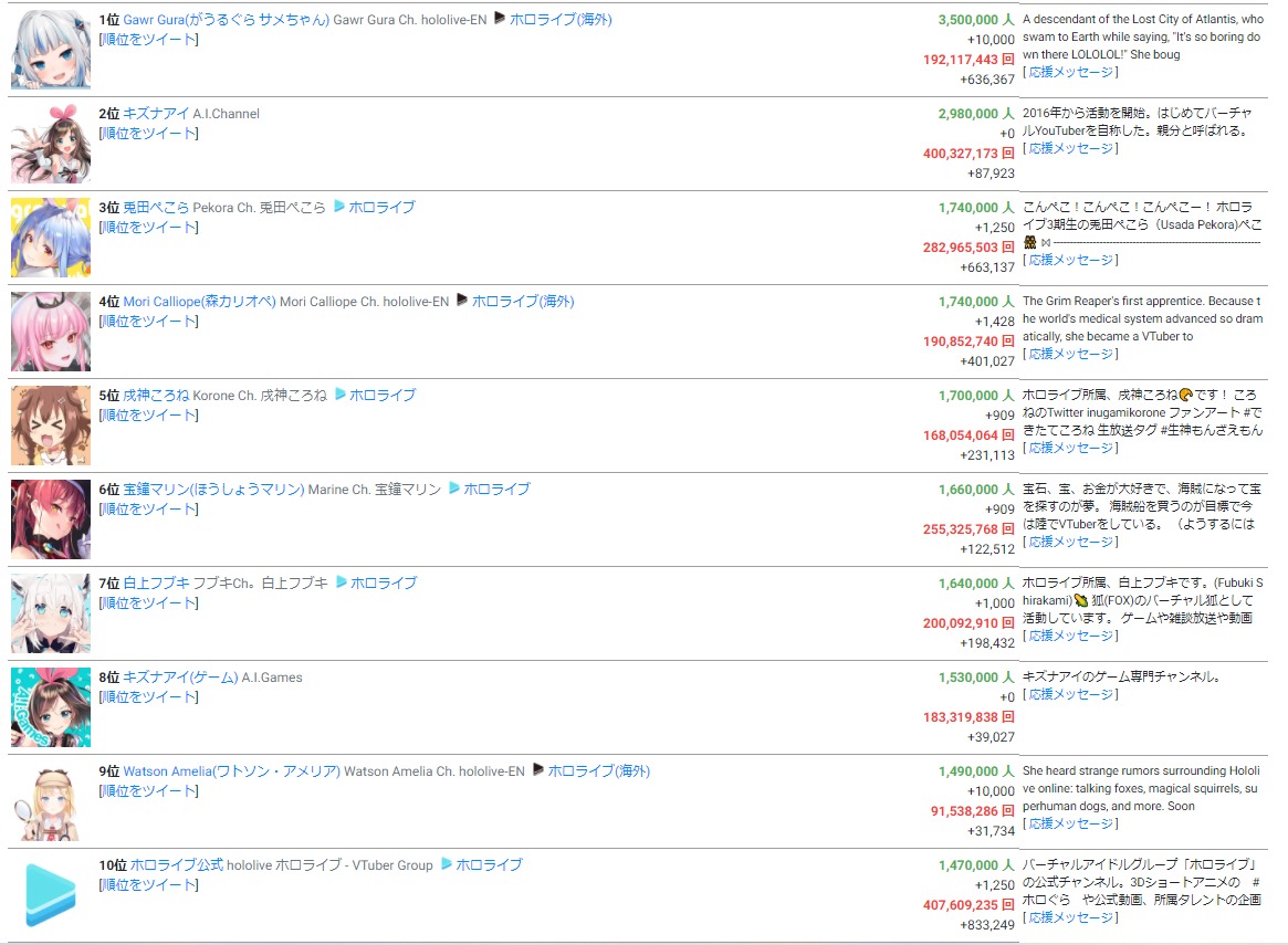 Top 10 subscribed Vtubers:
