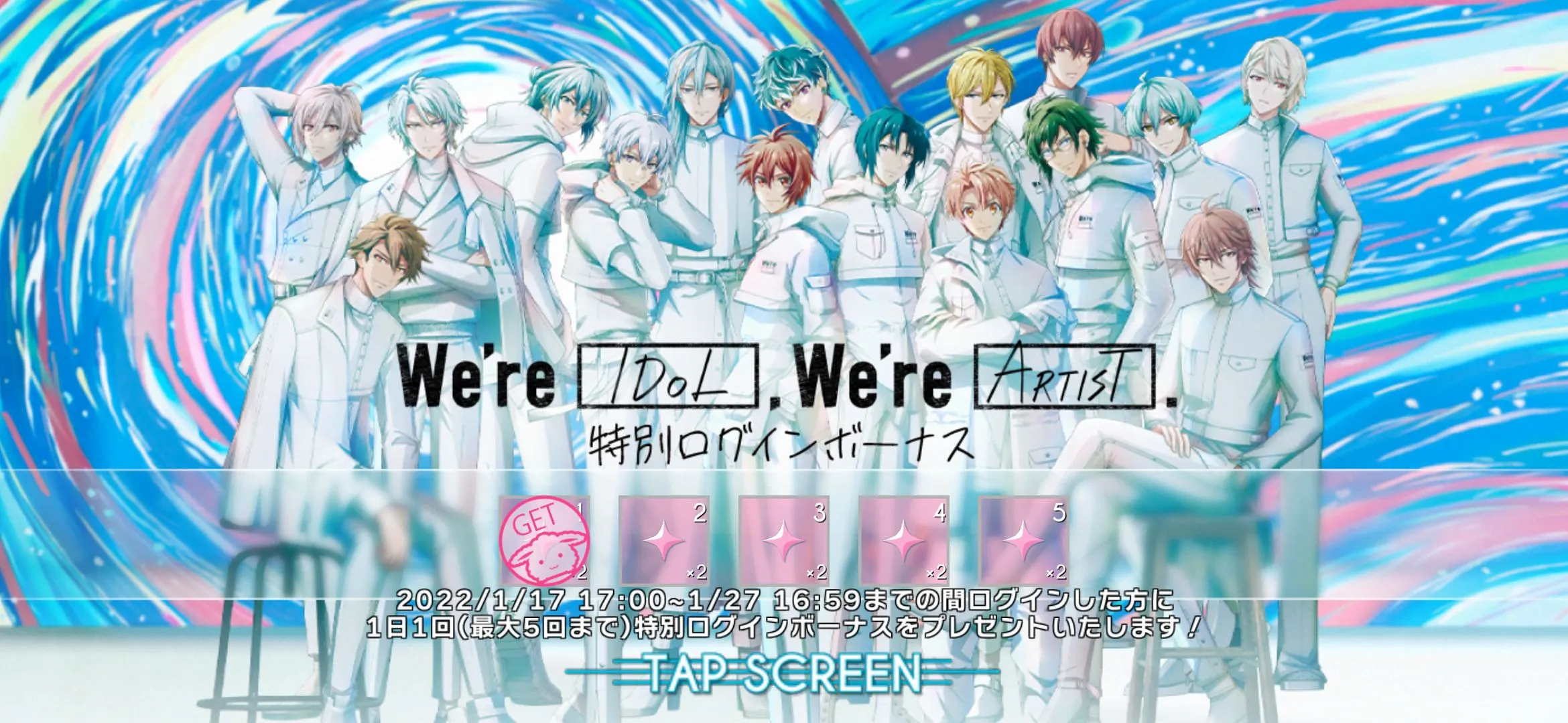 SSR [We're Idol, We're Artist!] members : Iori, Yamato, Mitsuki, Tamaki, Sogo, Nagi and Riku, Gaku, Tenn and Ryunosuke, Yuki and Momo, Haruka, Touma, Minami and Torao will give 20% UP for event item and 50% UP for grade PT!