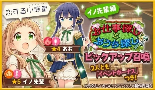 ¡En esta selección de dos banners, puedes obtener nuevas cartas de ★5 de Kotone Kazairo (CV: Honoka Inoue), Fa (CV: Hina Kino), Rakira (CV: Manaka Iwami) y Rufria (CV: Natsumi Kawaida)!
