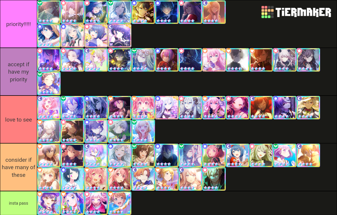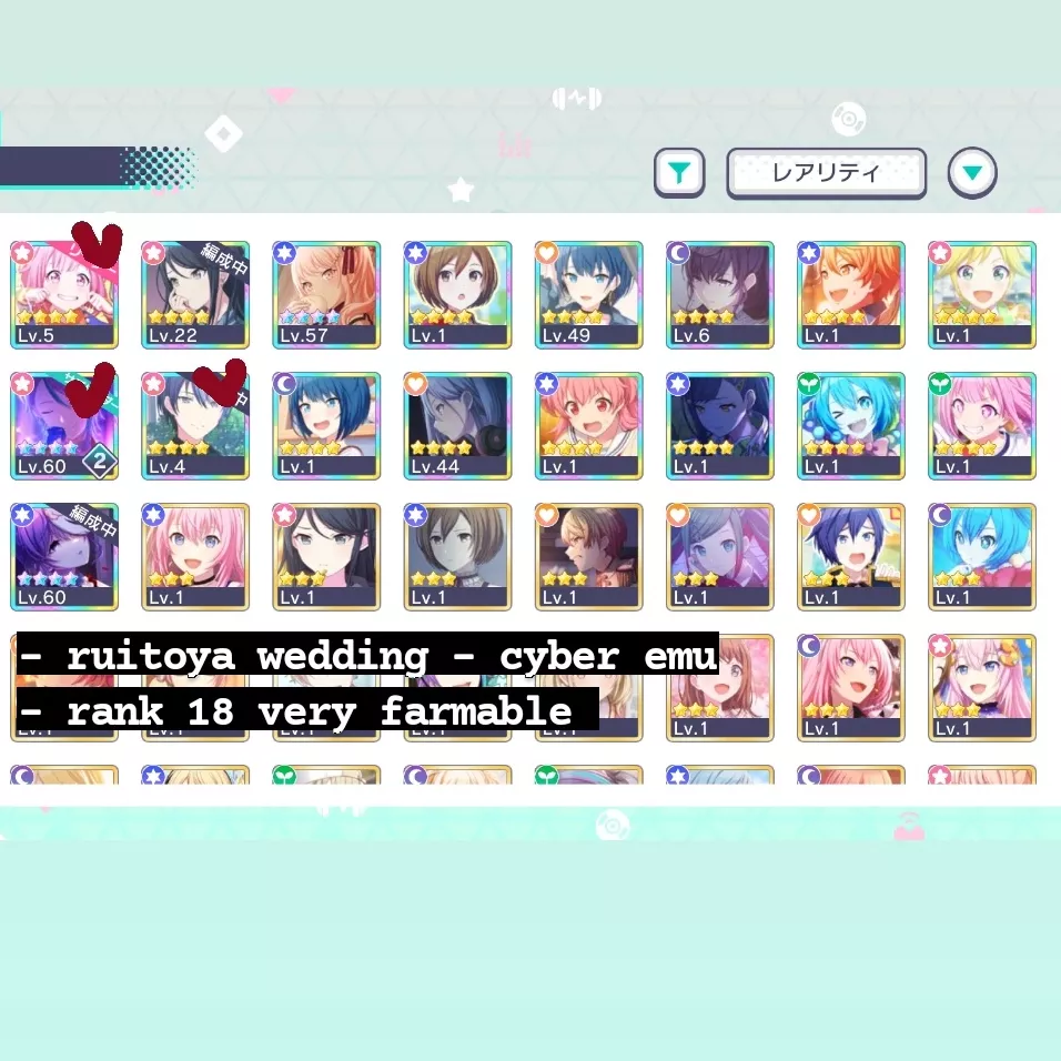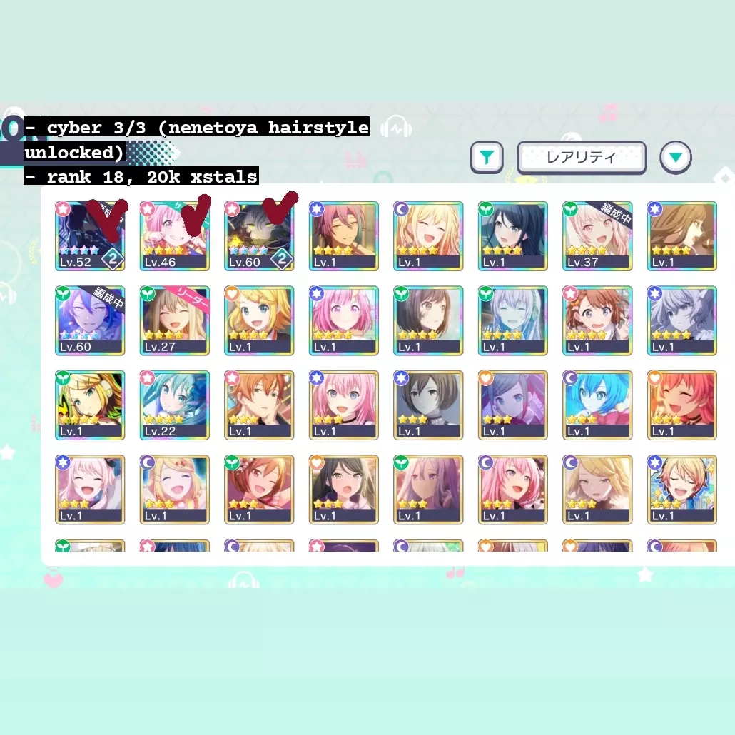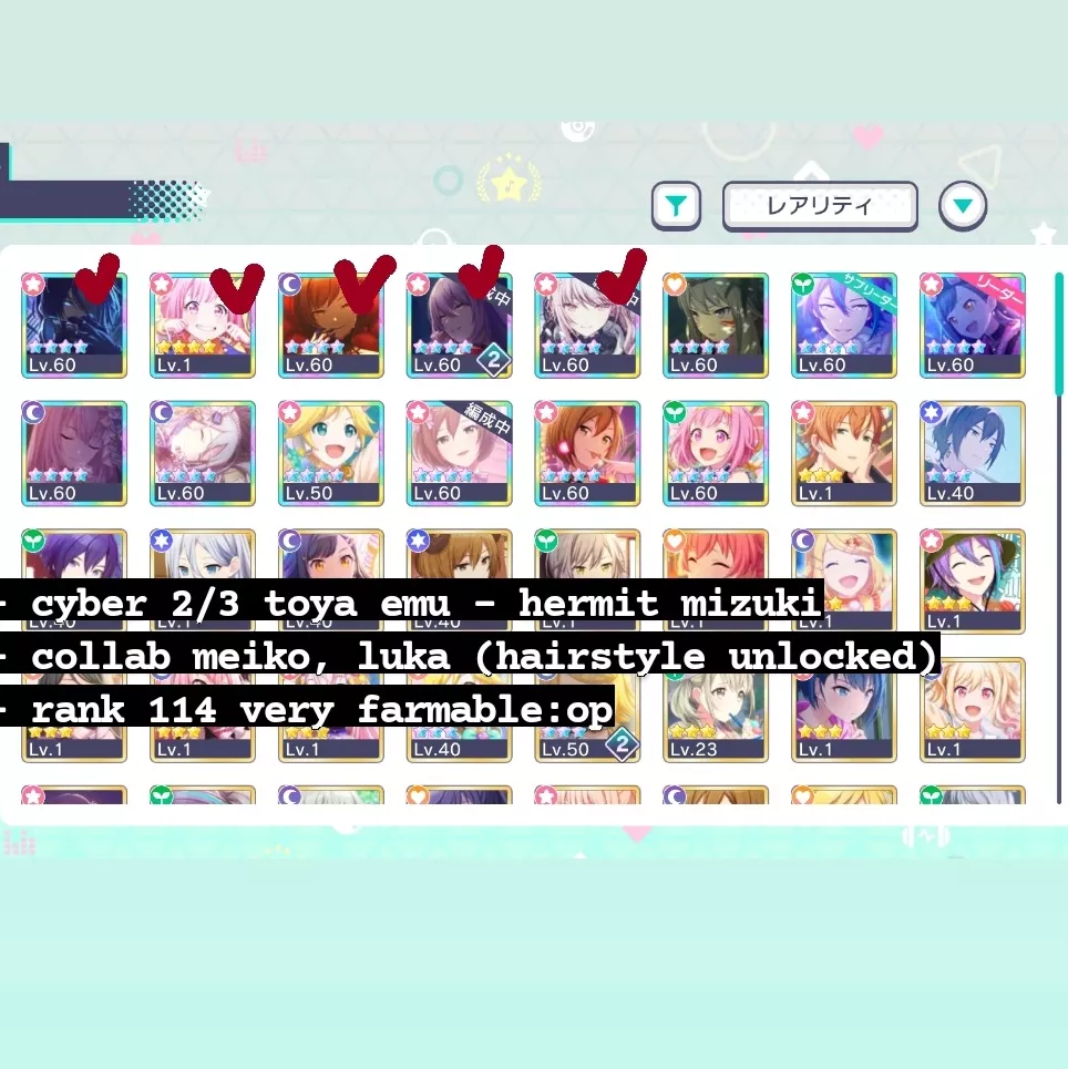 las cuentas del global puedo tradear por reroll +100k cristales o reroll 170k + estrellas de bandori ^^ las demás solo por mis dcs, la cuenta de las collab solo busco kaito y luka ^^ si tienen más mejor, puedo dar mas de una cuenta !