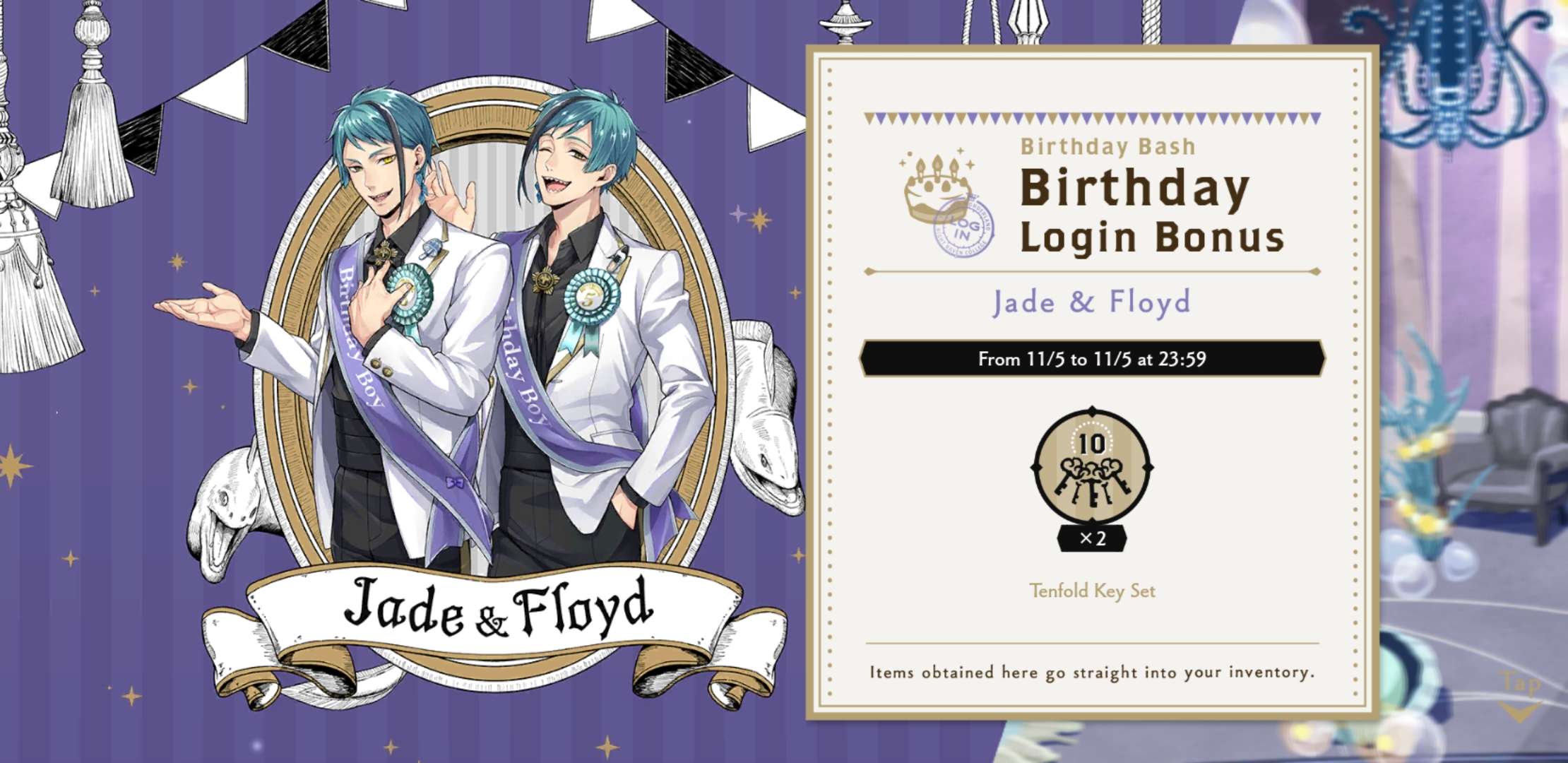 A blessing to have tweels's birthday today for we are in dire need of keys! Happy birthday to our very different twins! Can't pull for them but i wish I could give Jade a bunch of mushrooms and Floyd a free takoyaki. Wonder if Azul has a gift for them.