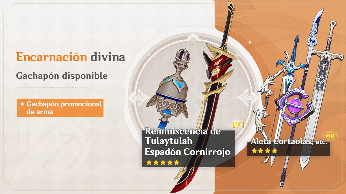 ● Durante el evento, podrás utilizar Senda divina para conseguir las armas promocionales de 5★ Reminiscencia de Tulaytulah (catalizador) o Espadón Cornirrojo (mandoble). Para más información sobre el sistema "Senda divina", presiona en "Detalles" en la esquina inferior izquierda de la interfaz de gachapón.