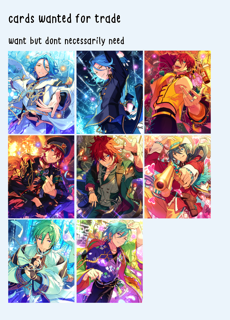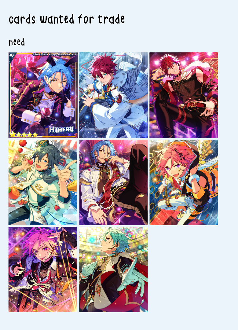 side note: the cny himeru card is an ABSOLUTE need as well as at least one 5* of other crazyb members. i'll be cheking your acc before formally trading so if you dont fit in the requirements then i sincerely apologize ^^;
