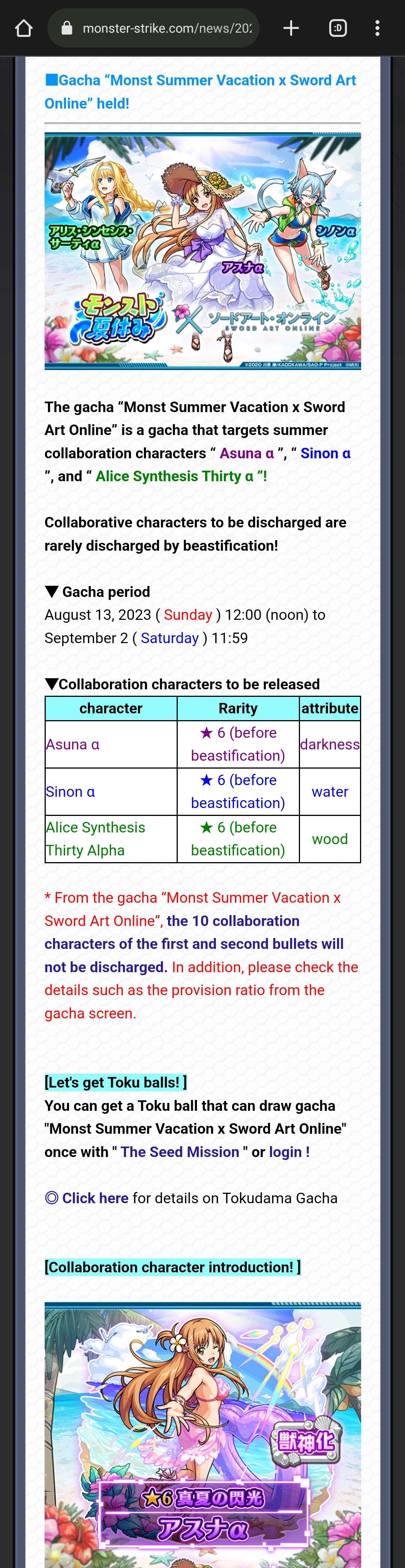 Monster strike will collab SAO(Sword art online) on 13 August(13/8) with together with their 10 anniversary celebration