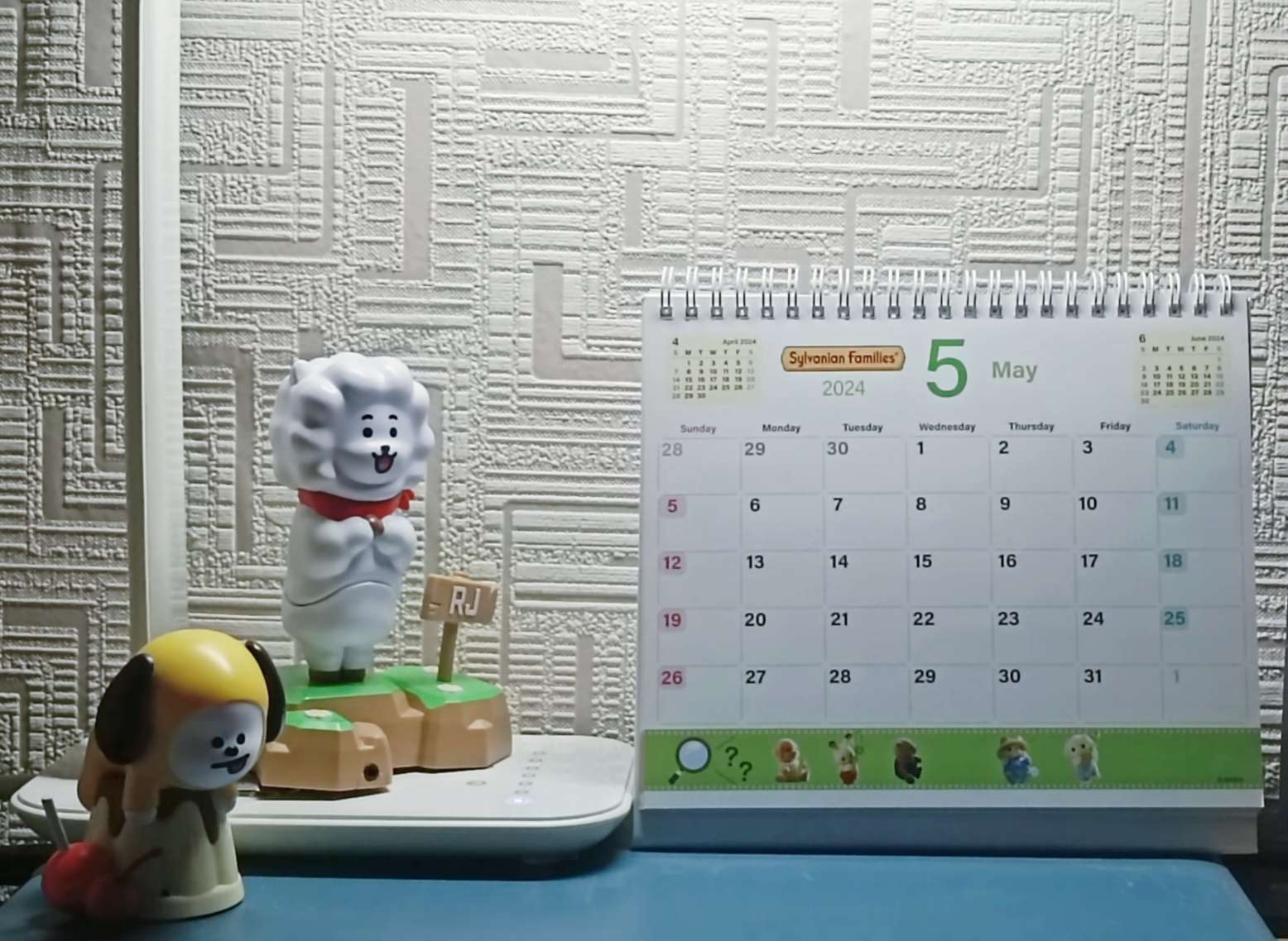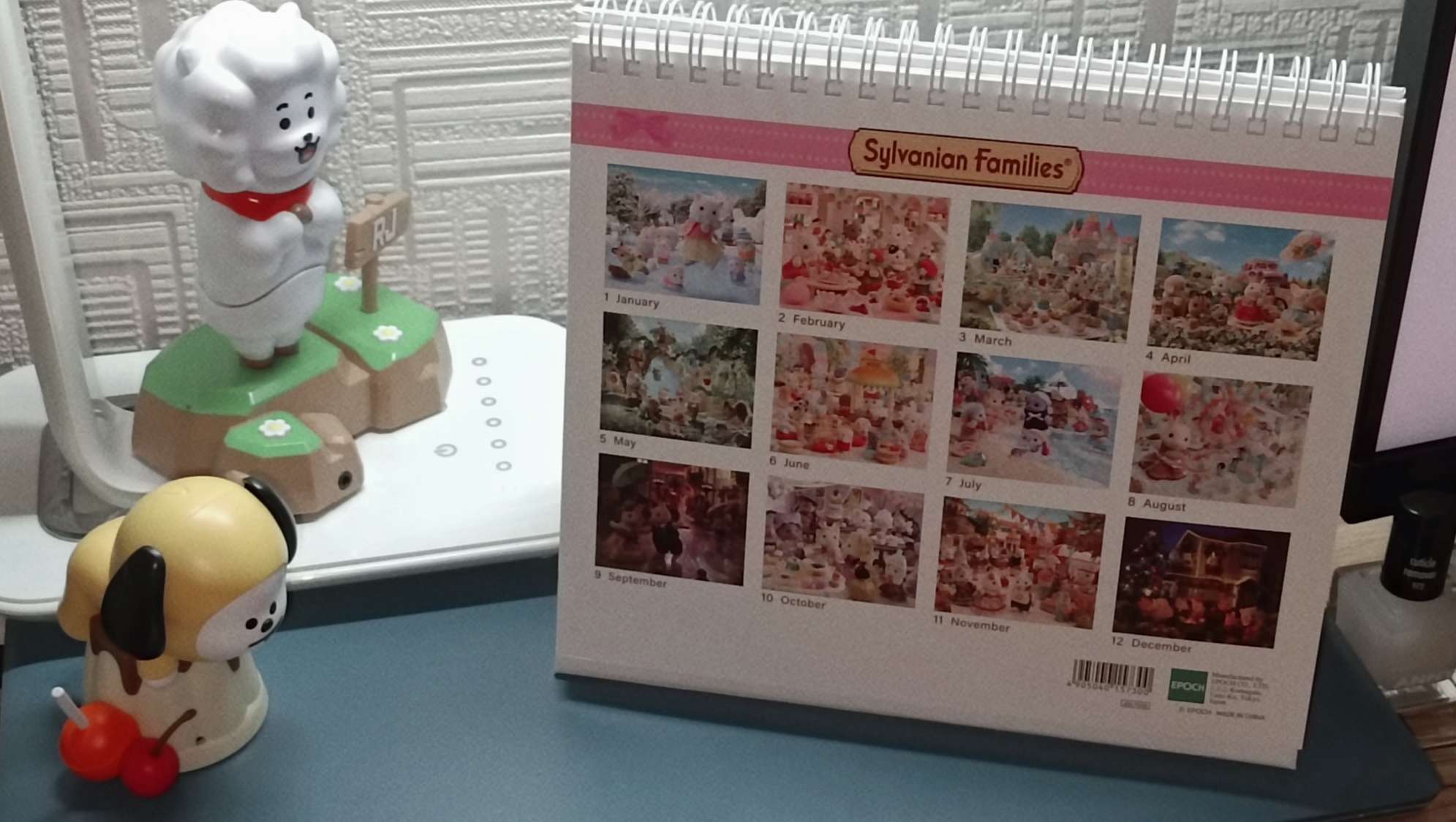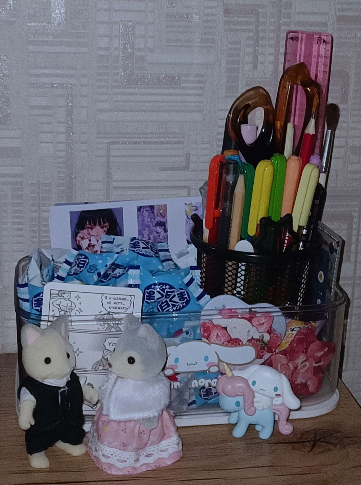 На моём столе есть имбовый календарик с Sylvanian families, лоточек с конфетками, небольшой уголочек Cinnamoroll, ну и ещё несколько милашных штучек (самое крутое это котик 2008 года) :3