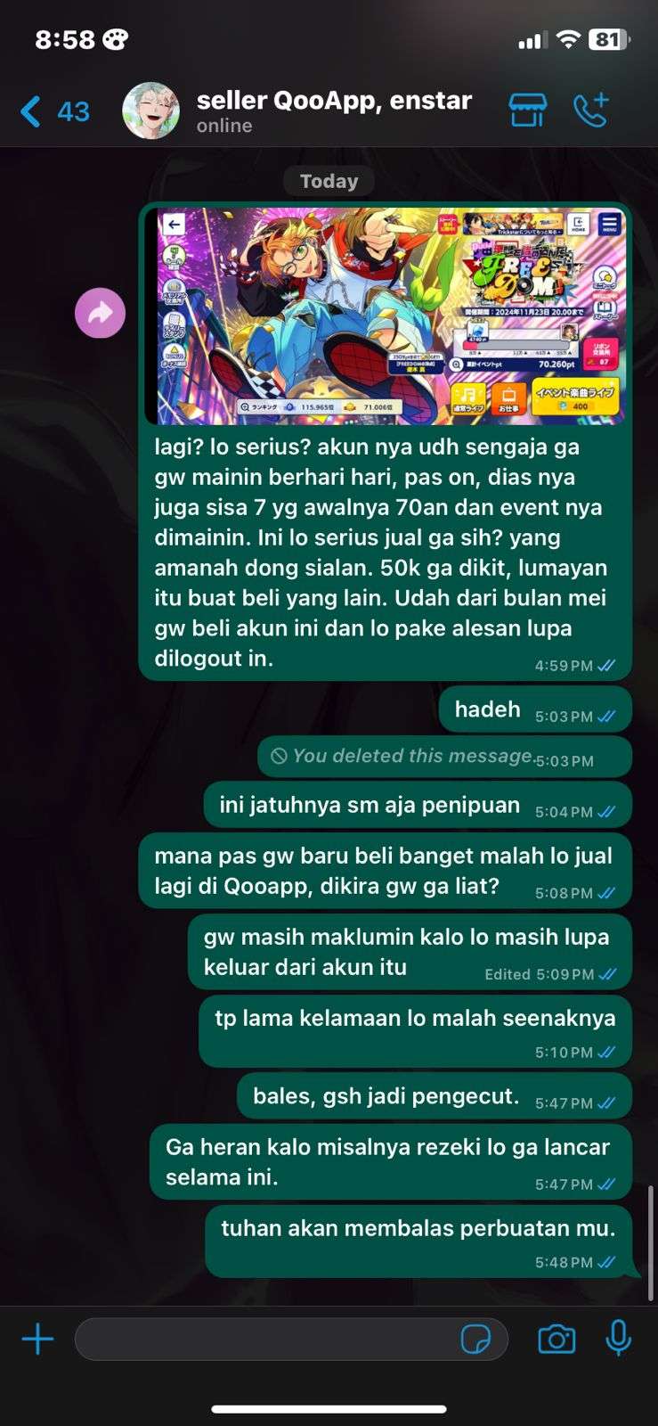 be aware ya guys sm ini orang, yg wa nya 089676796000. jadi, ak beli akun di dia sekitar bulan Mei 2024 dan TERNYATA akunnya masih terus di mainin sama dia. Ak udah komplain dari kemarin kenapa masih dimainin alasanny akunnya dimainin sama kerabatnya, kan gamasuk akal?