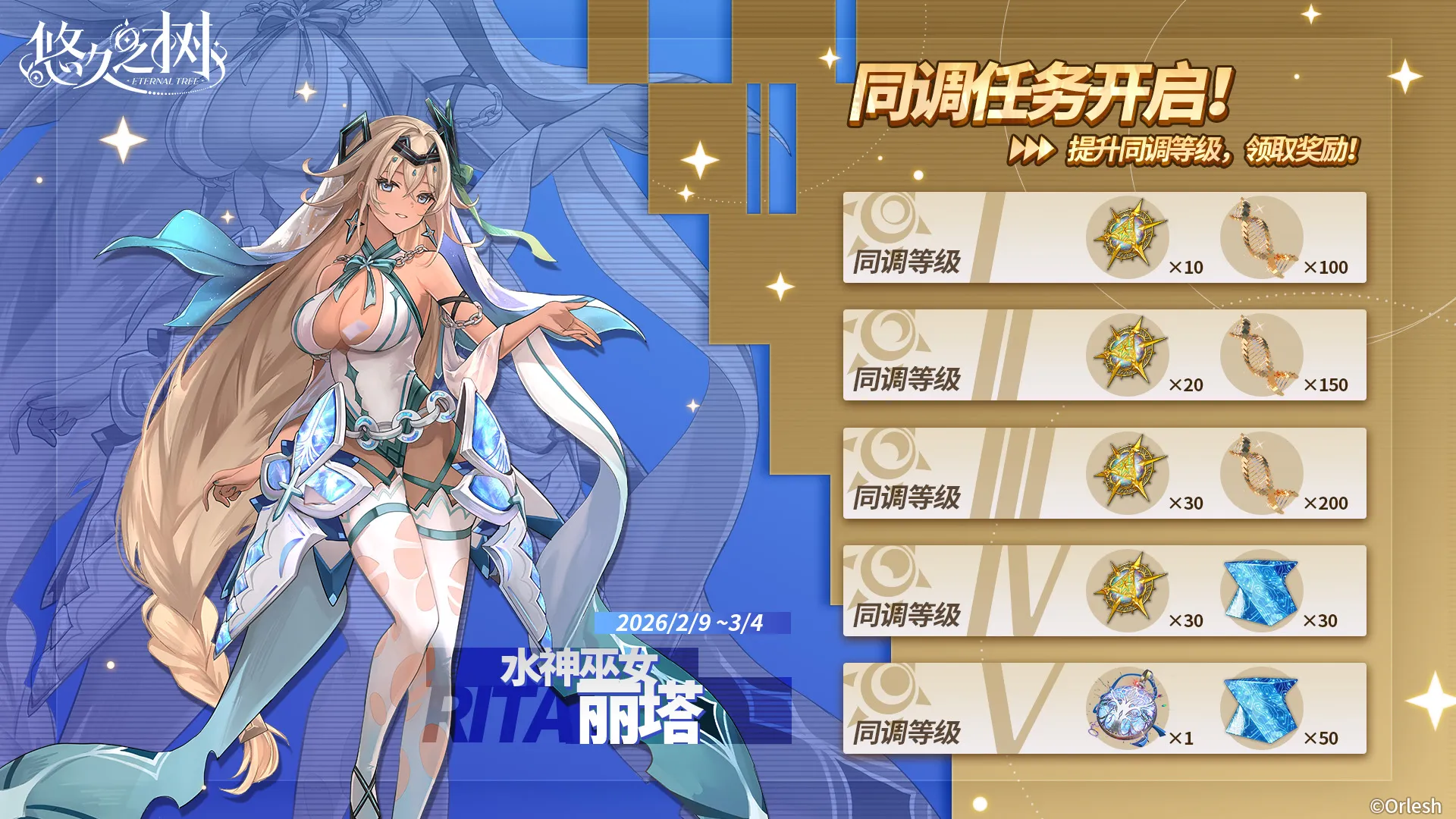 2月9日 维护后 - 3月4日 12:00,提升新角色「水神巫女·丽塔」的同调等级,即可获取耀金星徽等道具奖励!将同调等级提升至4级,总共可获得耀金星徽×90。将同调等级提升至5级,可获得银色誓言×1!