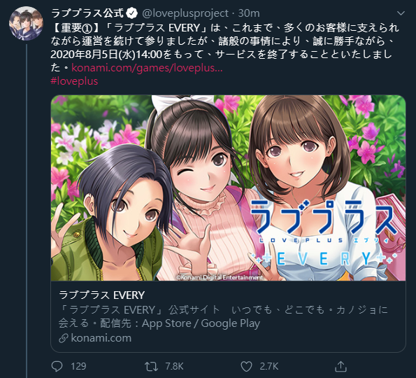 The server of Loveplus Every will shutdown on August 5 14:00 (JST).