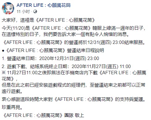 【停服】女性向手遊《AFTER LIFE : 心願萬花筒》宣佈將於12/31結束服務