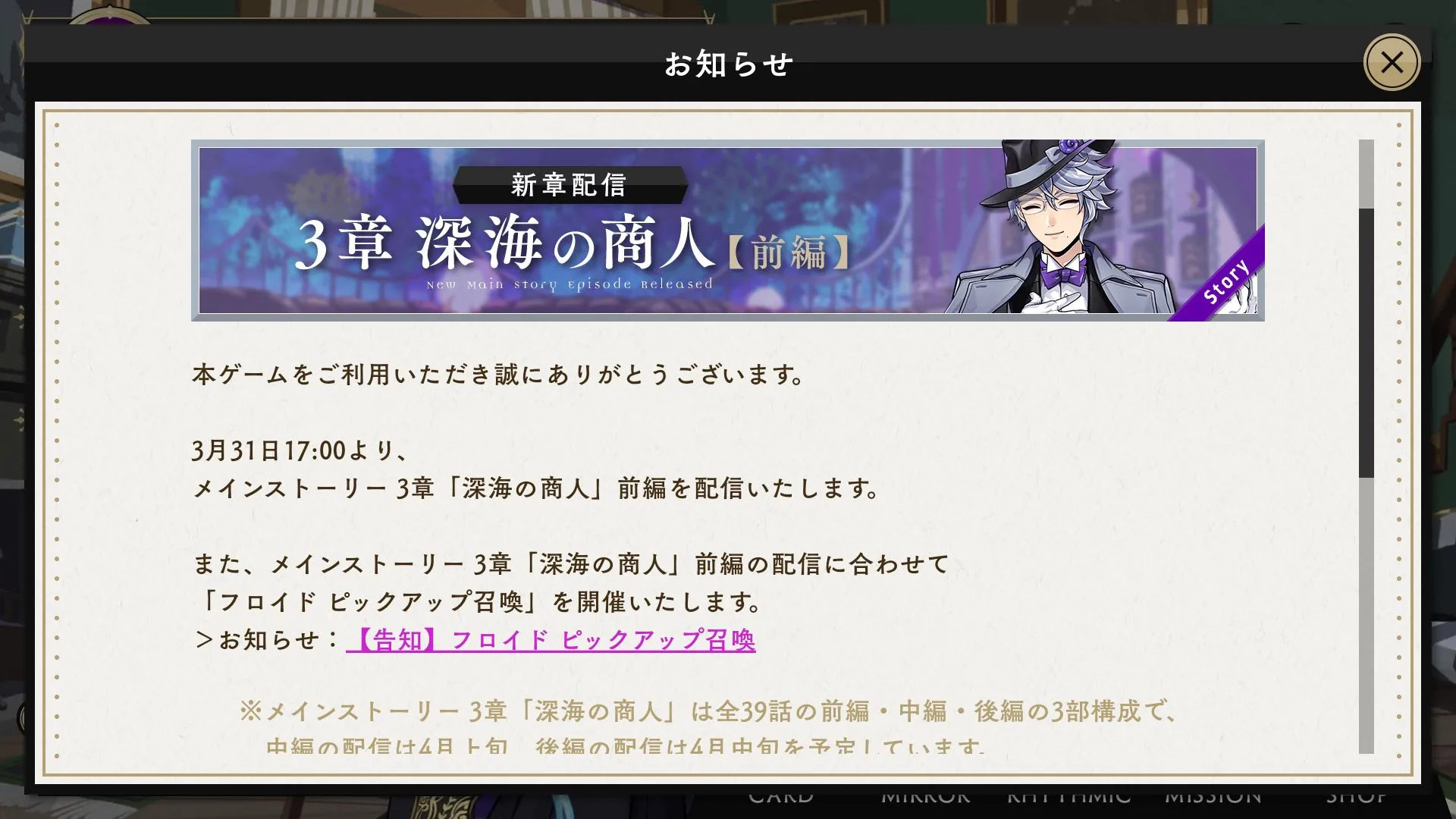 Main Story Chapter 3 "Merchant of the Deep Sea" Part 1 will be delivered.