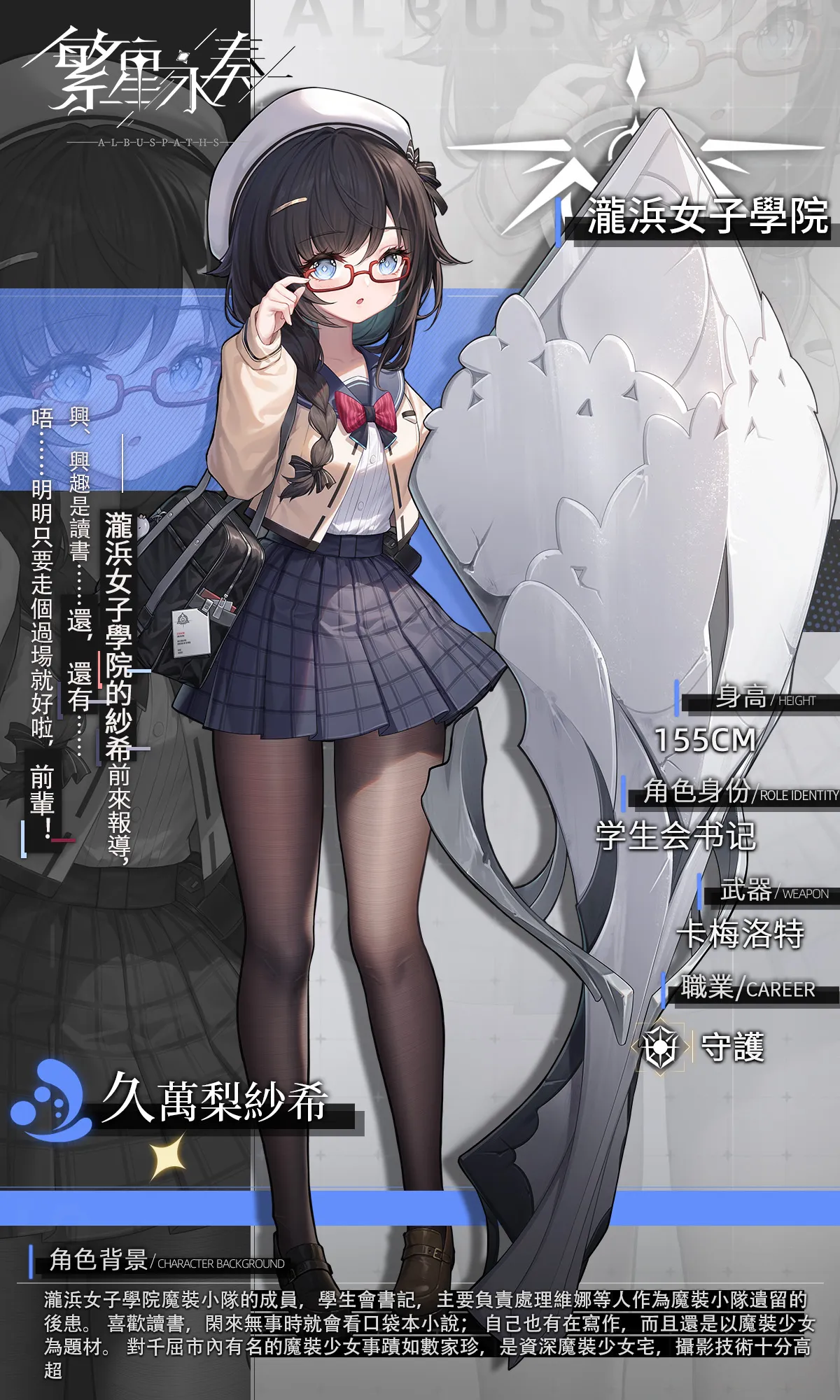 作為第一學區魔裝小隊的成員和學生會書記,紗希總是負責處理學生會和魔裝小隊的遺留問題。