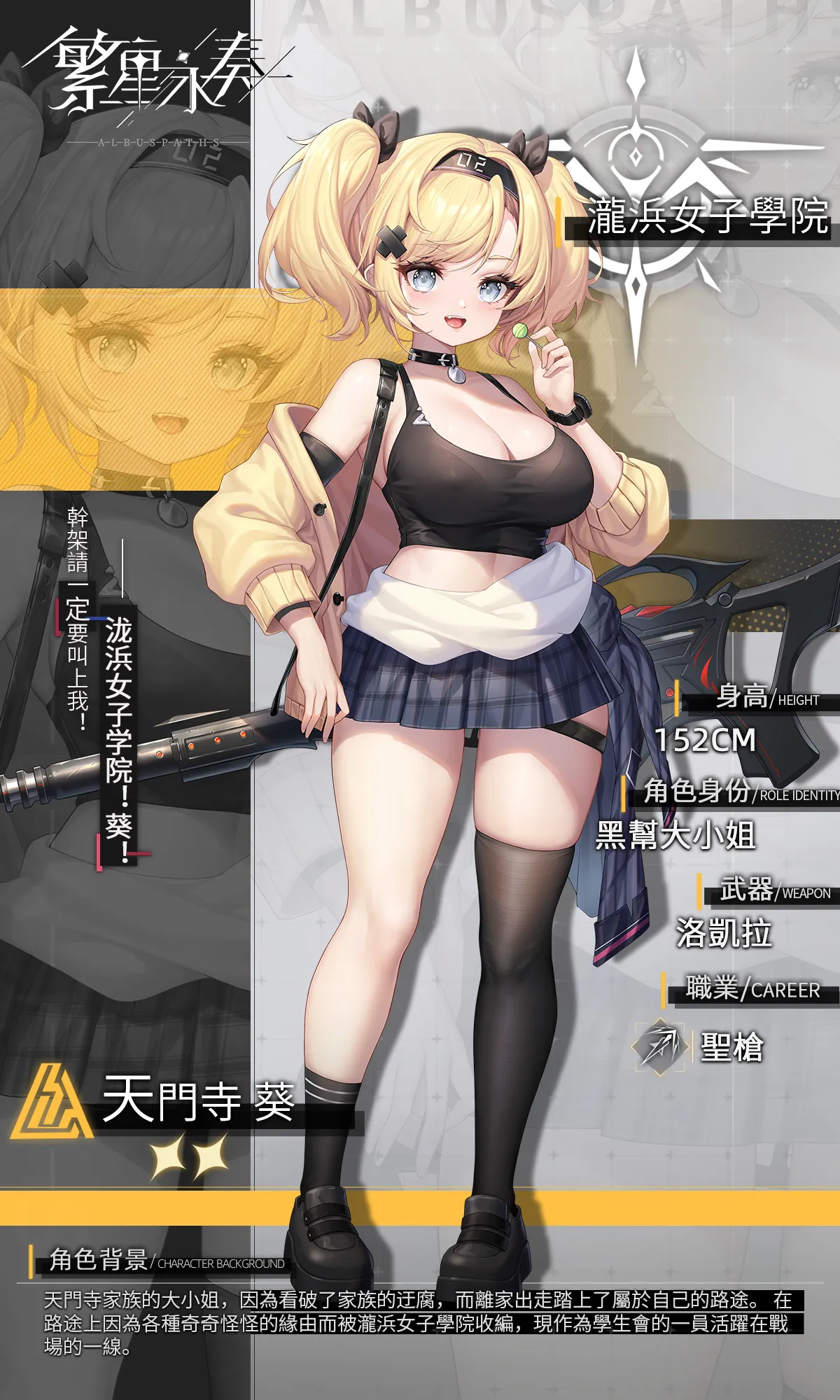 天門寺葵,這個名字在我們第一學區可是響噹噹的。 她是那個傳說中的魔裝小隊成員,也是學生會的“超級問題少女”。 您知道嗎? 她的腦筋轉得特別快,經常能想出一些讓人意想不到的點子,但這些點子有時候也會惹出不少麻煩,讓人哭笑不得。不過啊,葵小姐可不是普通的麻煩製造者。 她其實是天門寺家族的大小姐,出身於一個很有傳統的家族。 但是呢,她看不慣家族裏那些老舊的規矩和做法,决定離家出走,去尋找屬於自己的天空。