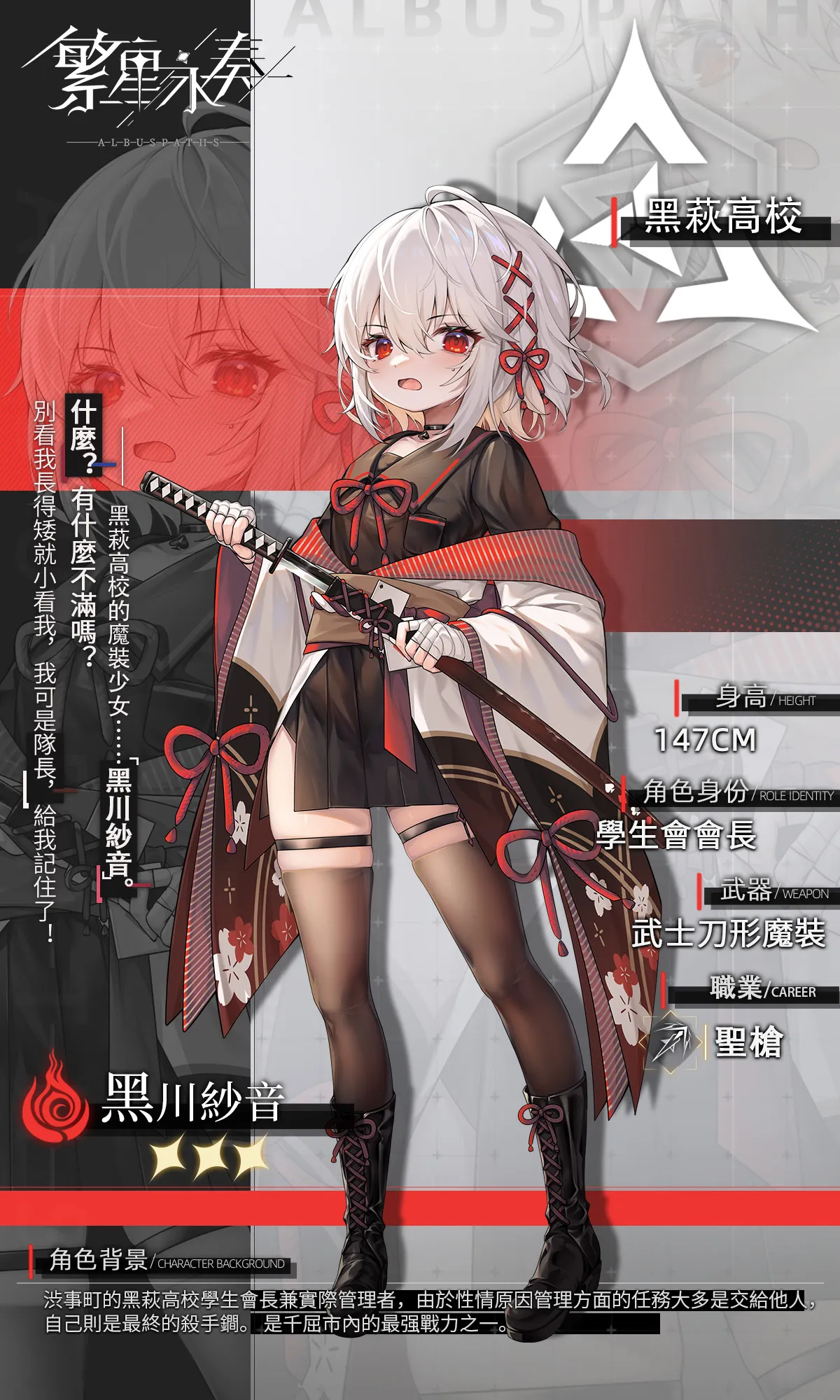 黑川紗音是黑萩高校的學生會長,也是該區域控制塔的密匙管理者。 她個性隨和,對什麼事都滿不在意。 儘管因為她的性格經常會將自己的工作扔給顧問和其他學生們,但每到關鍵時刻,她總是能出面解决問題,堪稱學校的終極殺手鐧。 甚至有人稱讚她是千屈市的最强戰力之一。