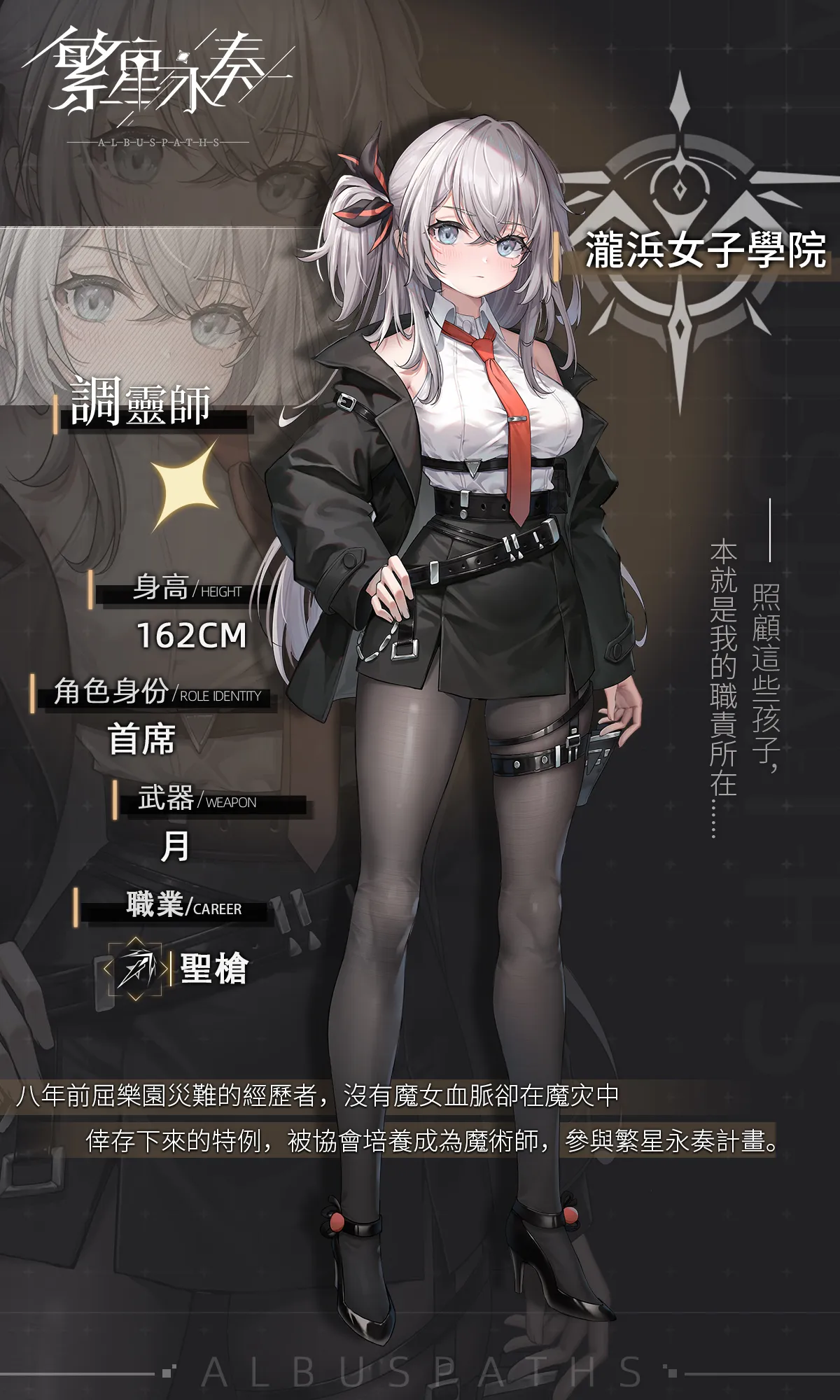八年前,當屈樂園災難降臨之時,她作為一名沒有魔女血脈的普通人在那場魔灾中奇迹般地倖存了下來。 她的這段經歷使她成為了一個特例,引起了協會的注意。 協會决定培養她成為一名調靈師,並讓她參與到了繁星永奏計畫之中。