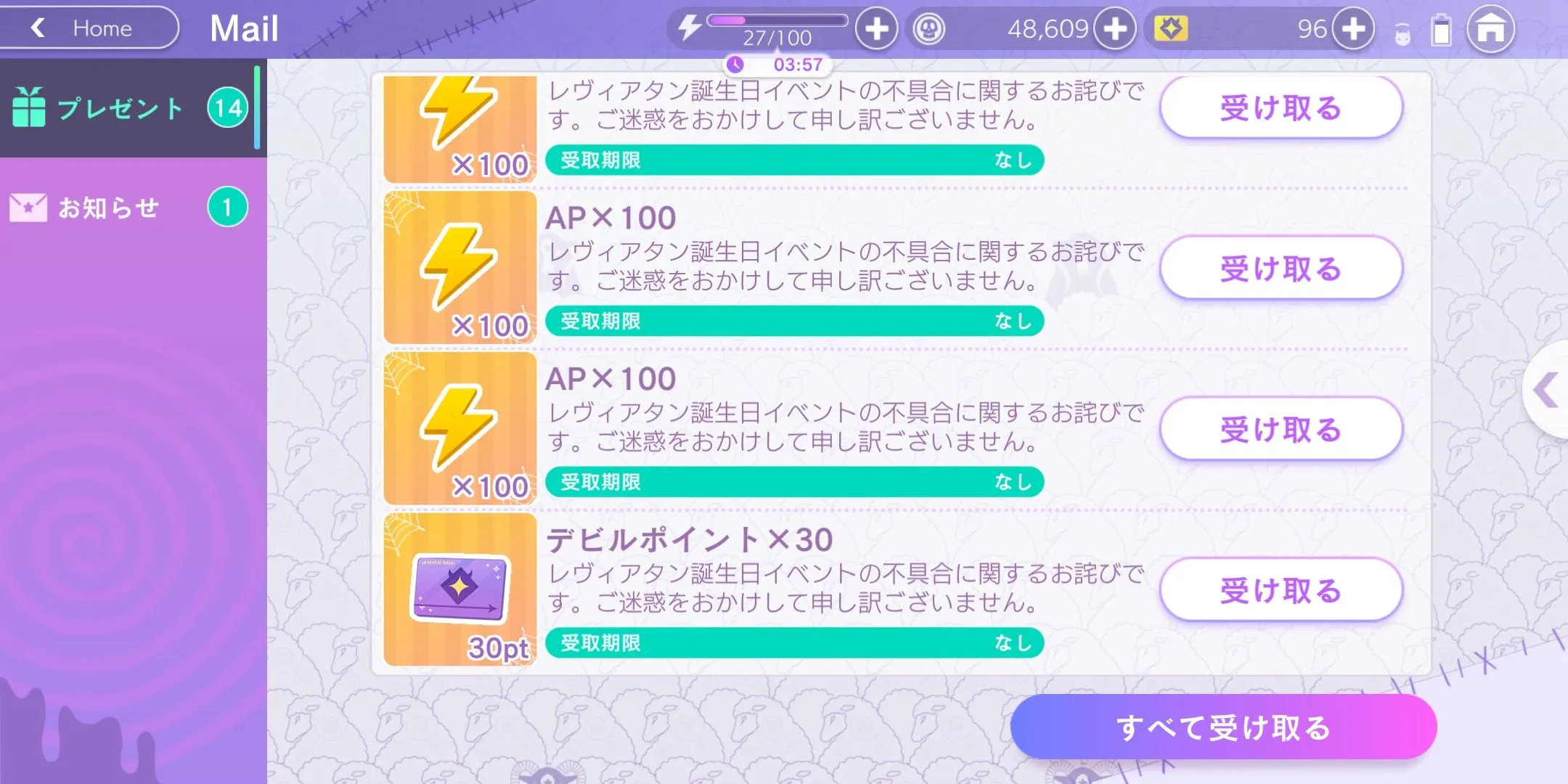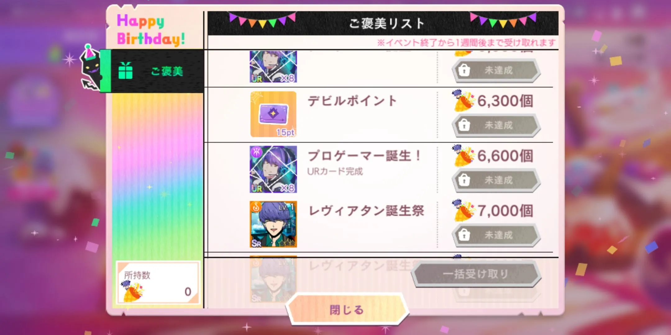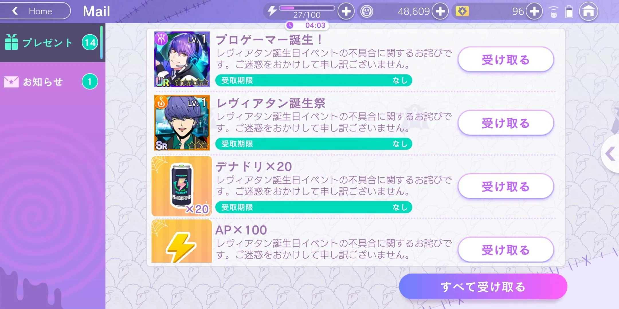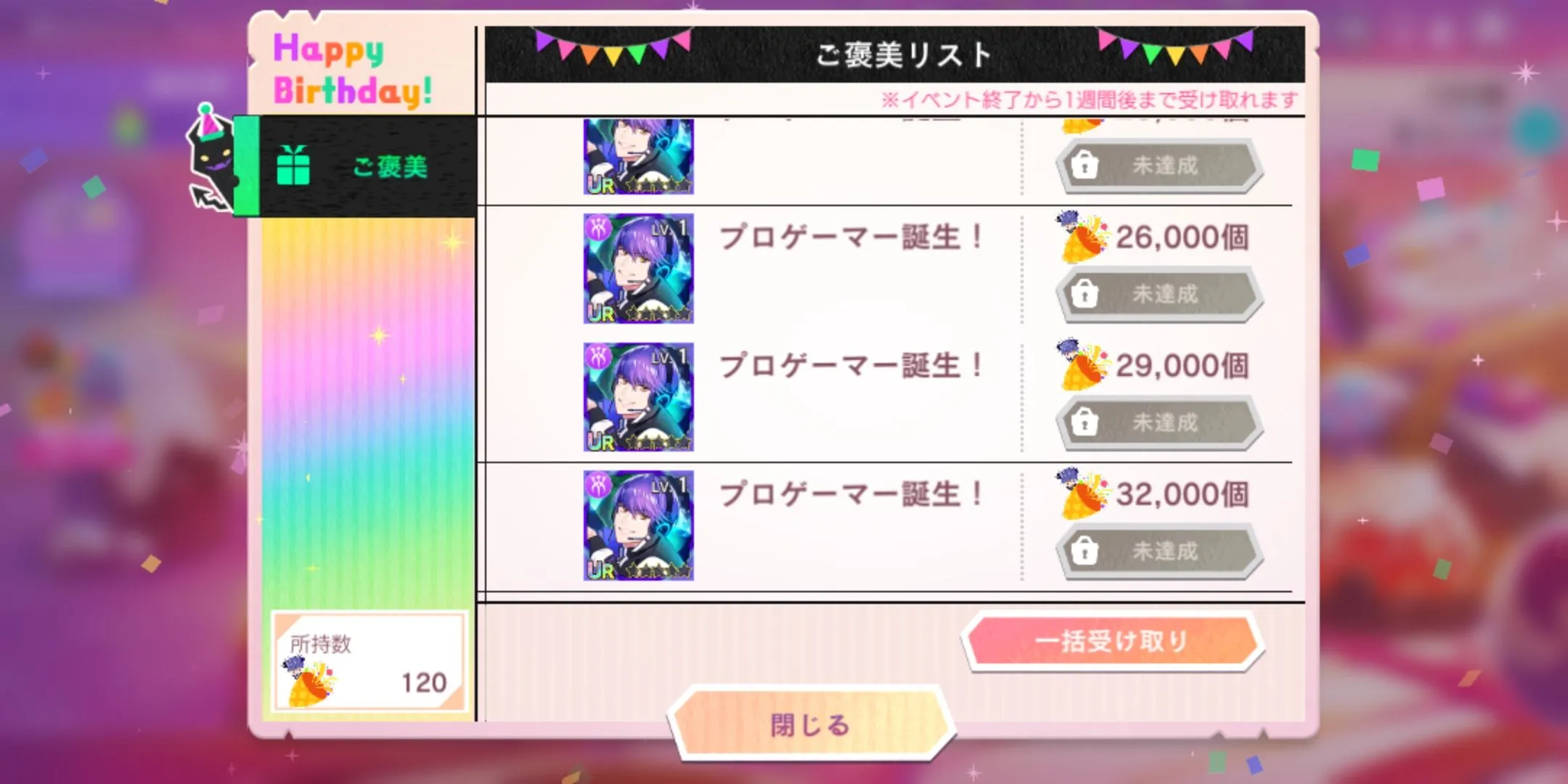 ntt补偿了生日UR×1、生日SR×1、次数饮料×20、体力100×10、DP30。无时限,可以合理利用体力。