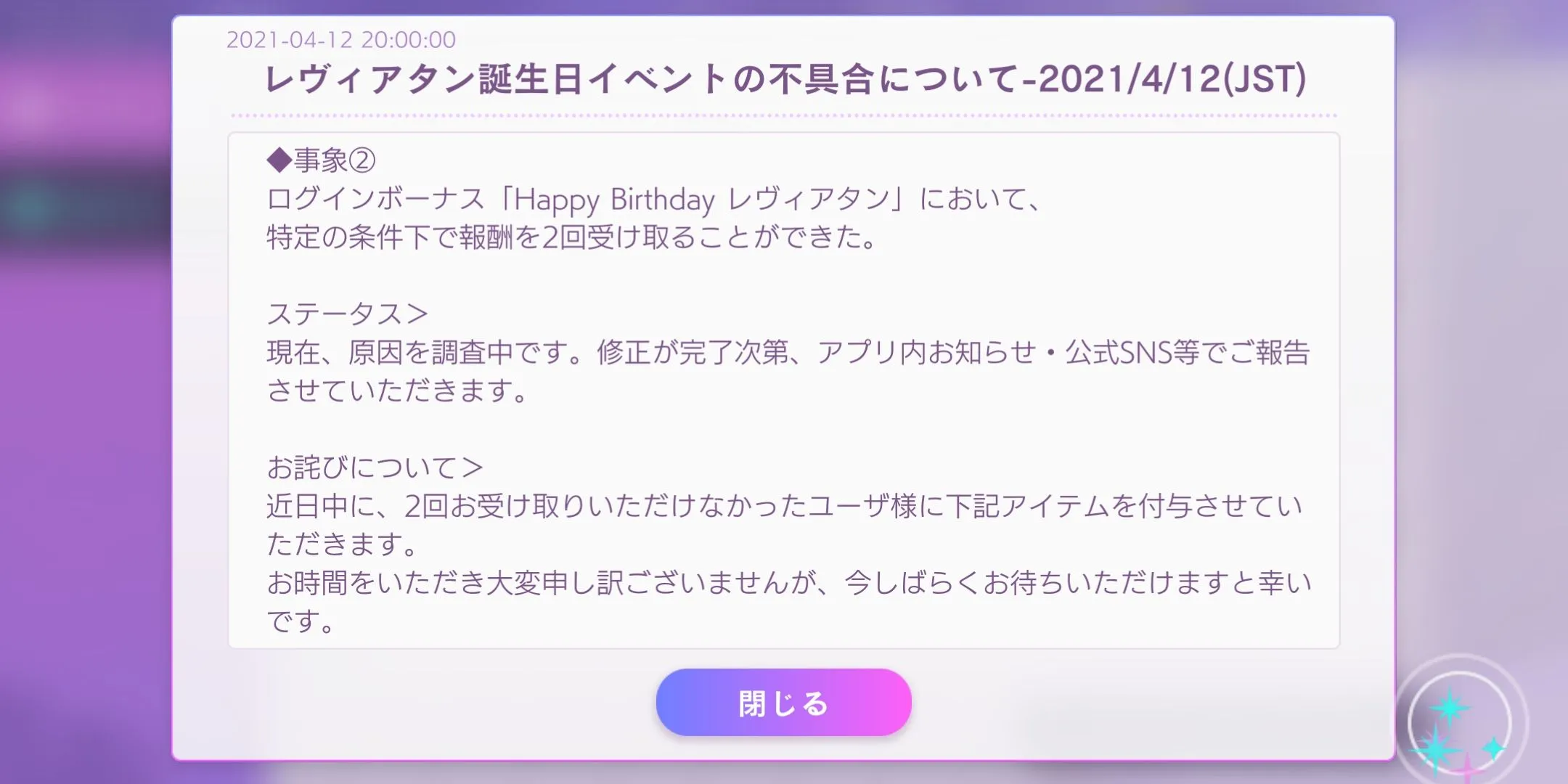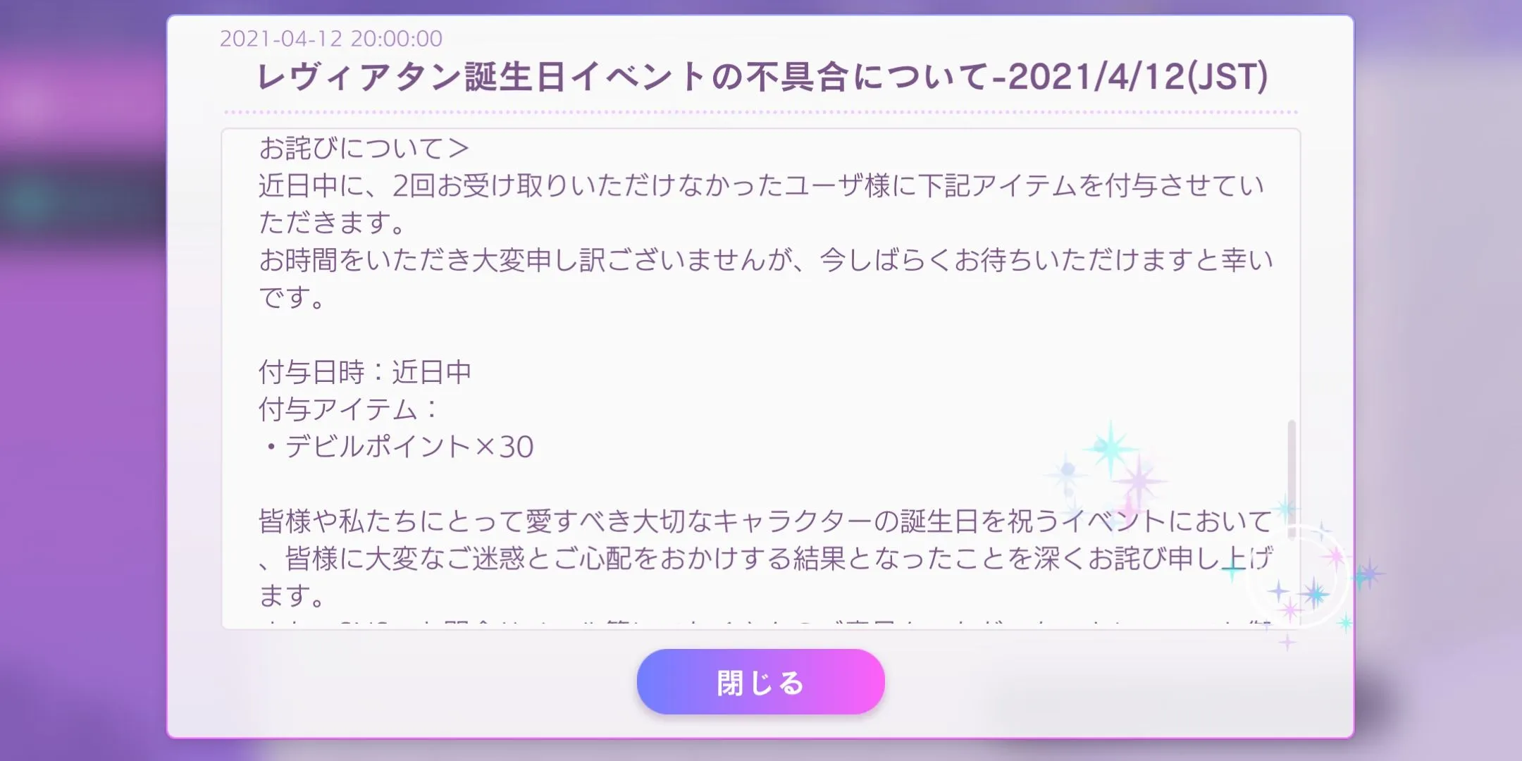 另外公告贴出了另一个bug,部分玩家在levi生日当天领了两次30dp的登录奖励。这几天还会再给只领了一次的玩家补发30dp~