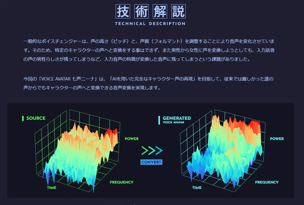 一般的變聲器是通過調整聲音的音高和音質來產生變化,因此不論如何調整,皆會留有原本的聲音特徵。不過 七声ニーナ 所使用的技術是語音轉換,能夠將用家的聲音完全變為其他人的聲音。