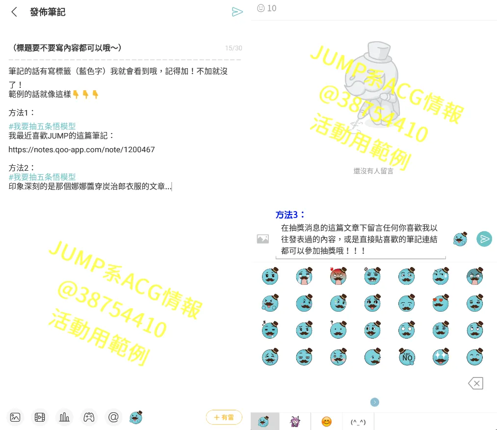 方法1:寫一篇筆記,內容有 #我要抽五条悟模型 標籤,並在內文寫上最喜歡我發過的哪篇筆記(可以貼上網址連結)