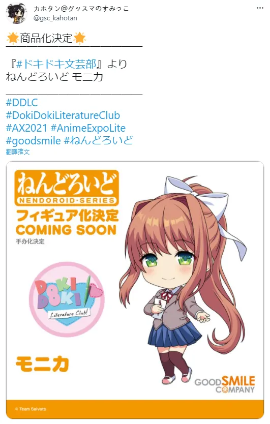 GOOD SMILE COMPANY 今日發推表示將製作《心跳文學社》Monika 黏土人,價格及發售時間暫時未知。