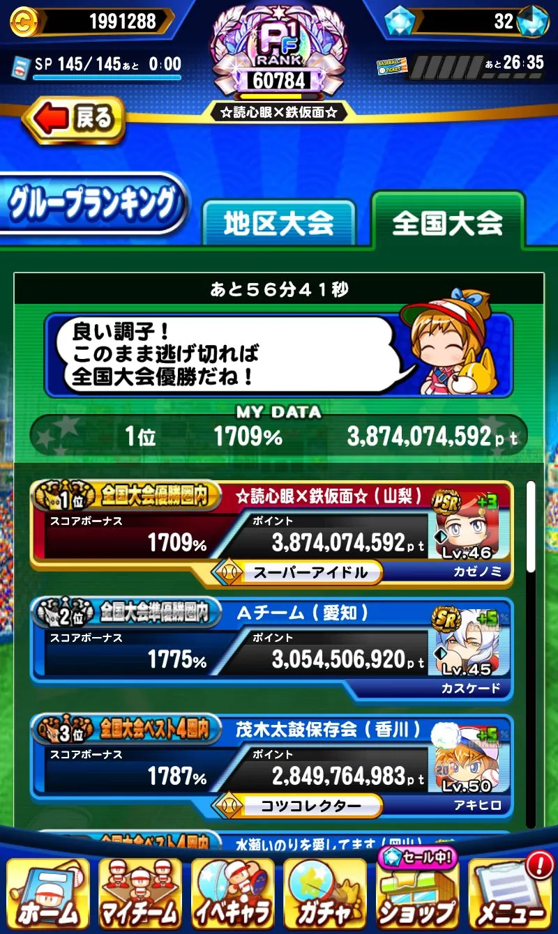 (這回真的是豁出去拼命呢,地圖開到第4輪將近一半+800多%,把攢了好久的2種行動力恢復券都用到見底了,外加約30顆前後的石頭…之後的真夏甲子園只能打打醬油哩XD~)