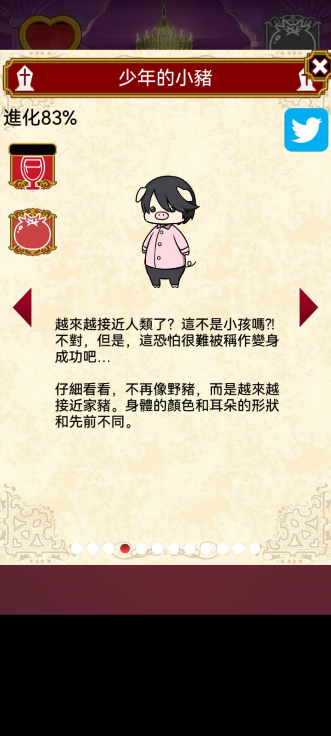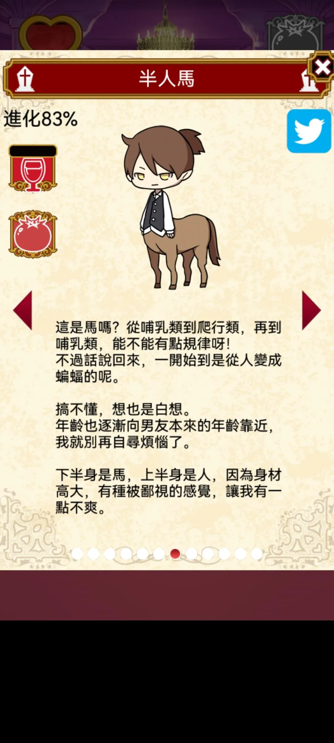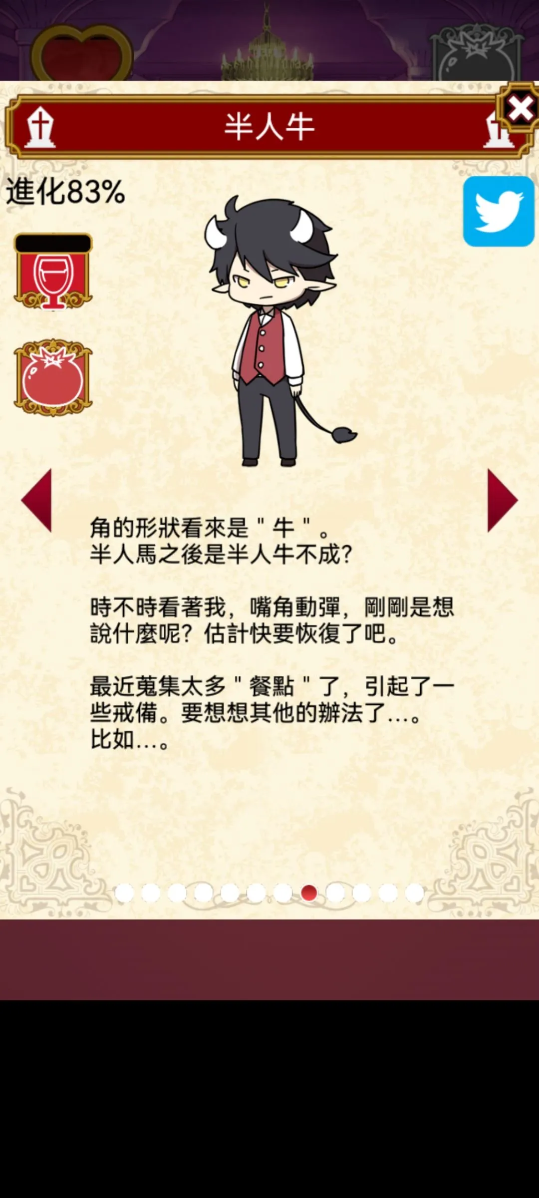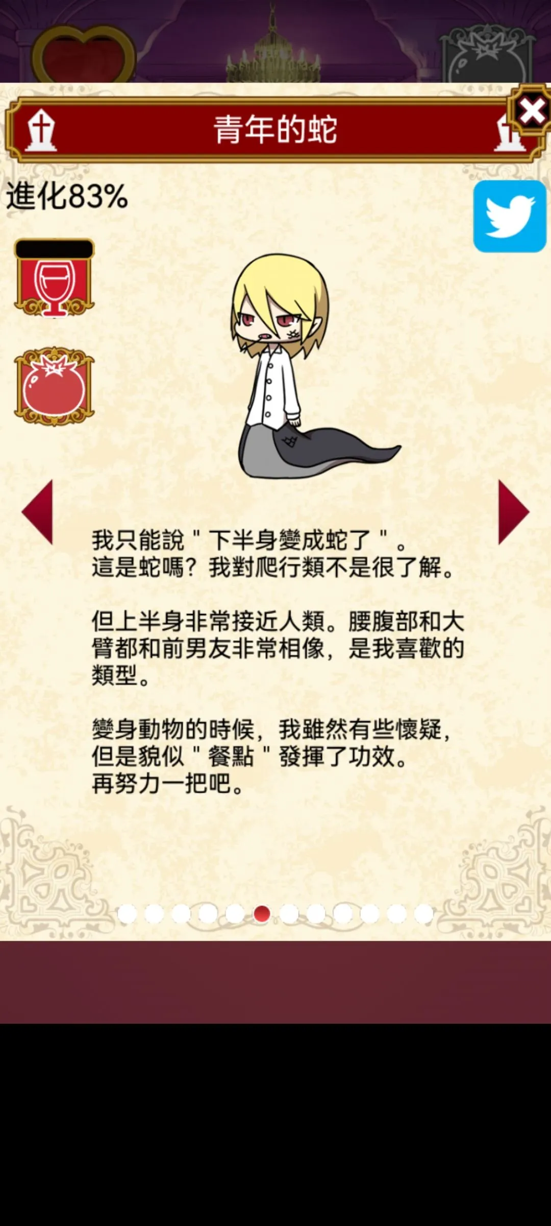 Rini 2022-01-29 13:01 筆記(1) 以下有剧透 本游戏全剧情+结局CG 故事背景,开端 成长图(我是在83%的时候截的图所以都显示83%)今天把结局打出来 结局b 自己独美 结局C 吸血鬼统治世界