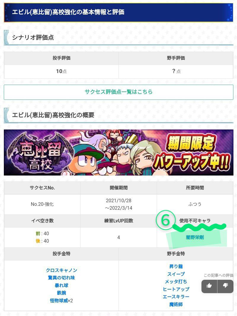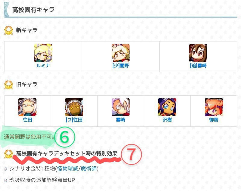 ⑦這邊列出來惠比留強化的固有角色,點他們的頭像可以通往各人物相關詳細內容頁面。另外還提到了把固有角色(1人即可)放入卡組育成時會發生的特效:高校金特+1種&魂吸收時追加經驗點提升(稍後會提到)