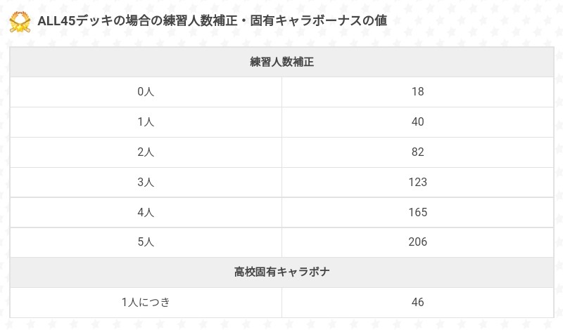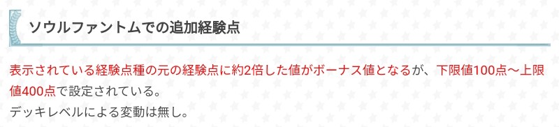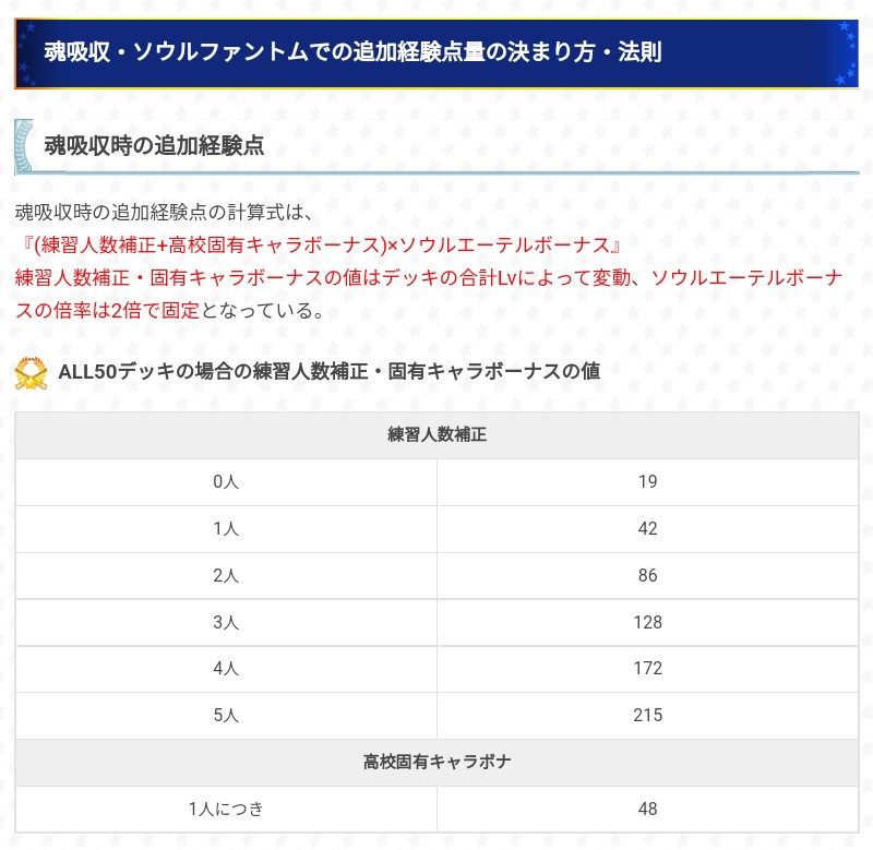 關於魂吸收時&消滅幻影時,追加經驗點數量的算法,可以看一下。攻略網提供的魂吸收數據會受到育成卡組內角色的等級影響,分別是全員(包括助人)50級(PSR+5)&45級(SR+5or摻雜PSR+3以上),追加經驗點就對照數字的2倍=(陪練人數加成+固有角色人數加成)×2⇒大致就是在說魂吸收時陪練人數越多可獲得的經驗點越多。