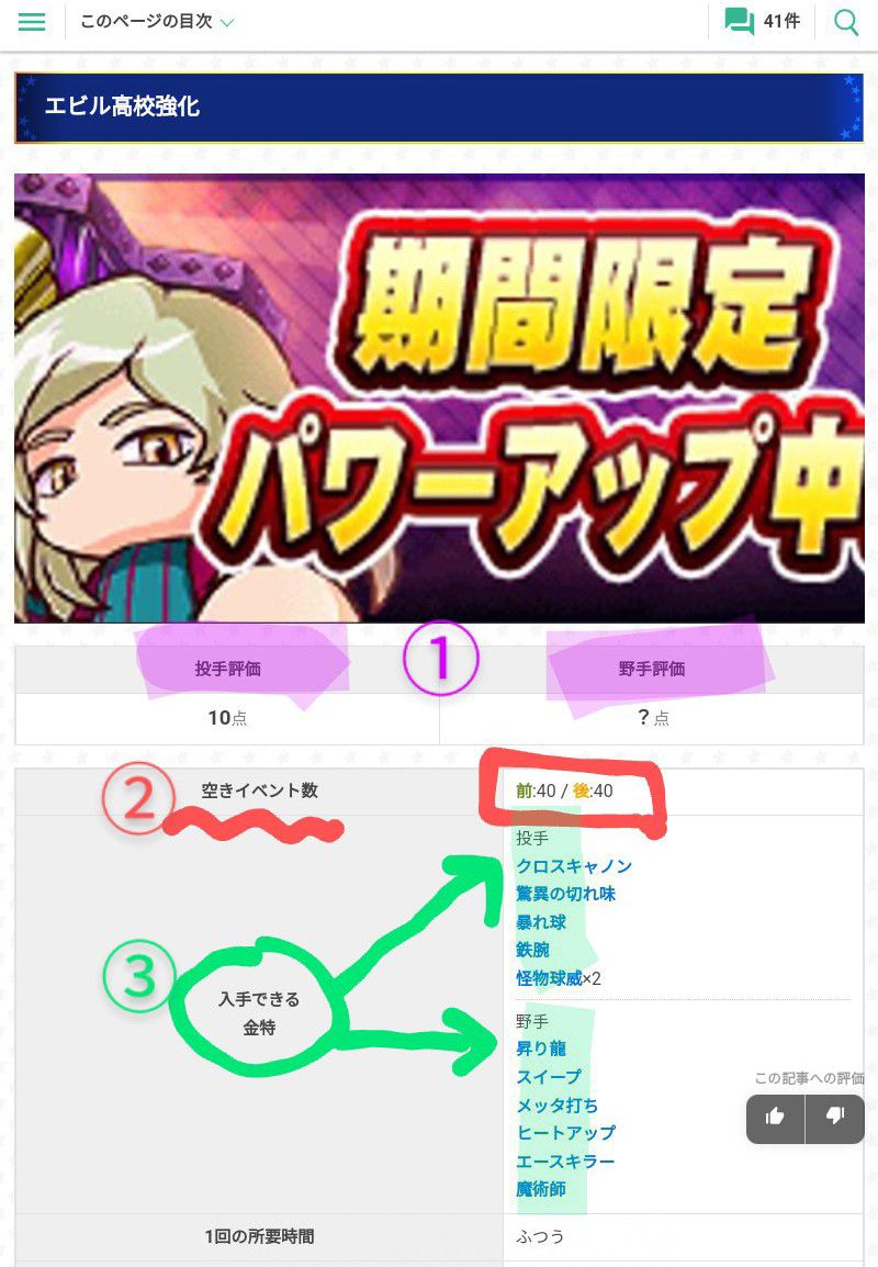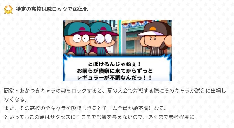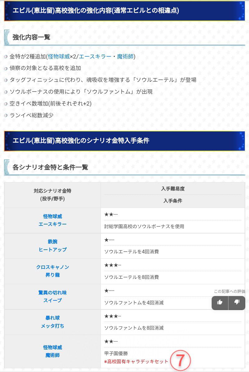 這裡敘述了強化內容&與通常時的不同點:金特追加、可偵查對象高校追加、育成系統的改變、可發生事件總數的增加、高校隨機事件總數減少等。下面表格則是高校金特的取得條件:(由上而下)使用討總學園的魂之加成、消費4(8)次的魂之以太、消滅4(8)次的魂之幻影、甲子園優勝達成(卡組中須至少一固有角色)⇒得知在全高校金特取得前提下,我們安排投手卡組時可以免去帶怪物球威者&鐵腕只需要加入一名就有很大機會拿下2個虹特了。