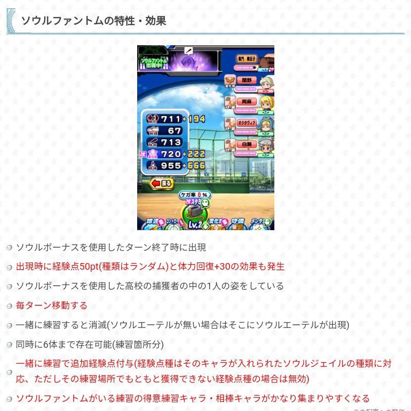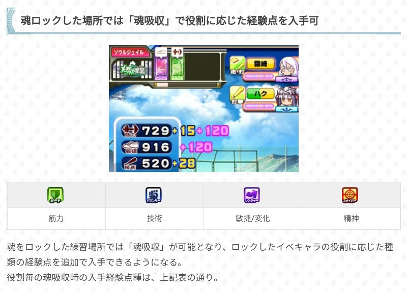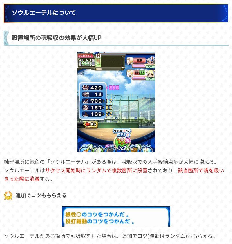 關於魂之以太的說明,在練習項目的右下方有一綠色菱形圖標(如攻略附圖中的變化球項目右下角所示),可以使魂吸收時歸0的幅度大幅提升(至於網站說練習經驗點(不包括追加經驗)大幅提升的部分,在下倒是感覺不太出來;另外消滅幻影不同於魂吸收)&額外取得特能減免;育成開始後隨機複數出現,魂吸收過後就會消失。