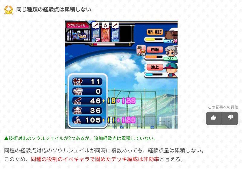這邊是在說魂吸收時(讓計量條歸0的練習過程),額外增加的經驗點(+N)種類是隨著可被偵查對象成員頭上的屬性來決定的,而致使屬性多寡原因在於我們育成卡組的安排(事件角色有固定役割,4種);另外,當複數成員頭上屬性有重複時,並不會使該種類經驗點在入手時變多。⇒當安排惠比留育成卡組時,役割種類不要太過單一造成入手經驗點比例失衡。