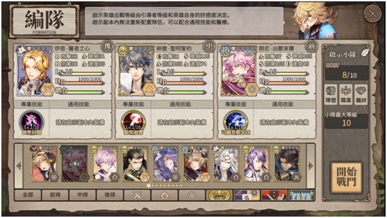 當選擇好需要挑戰的章節後就會進入編隊介面,在編隊中引導者可以從自身的英雄池裡選擇三名英雄出戰,進入副本後就不能再更換英雄了。
