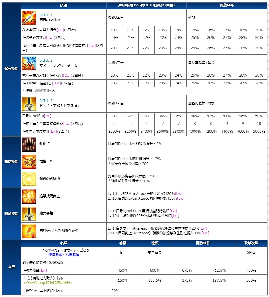 寶具提升方面,因為輸出很吃寶具,可以的話升到寶2以上會比較有力,當然只有寶1作為輸出也沒什麼問題