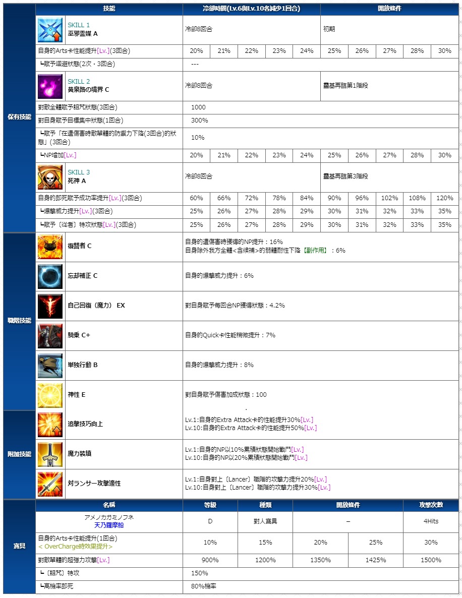 攻擊力為目前狂職最高,但是本身np運轉非常糟,算倒數前幾的,但是因為周回面強力加上主打A卡還有自充,問題也就不是那麼大
