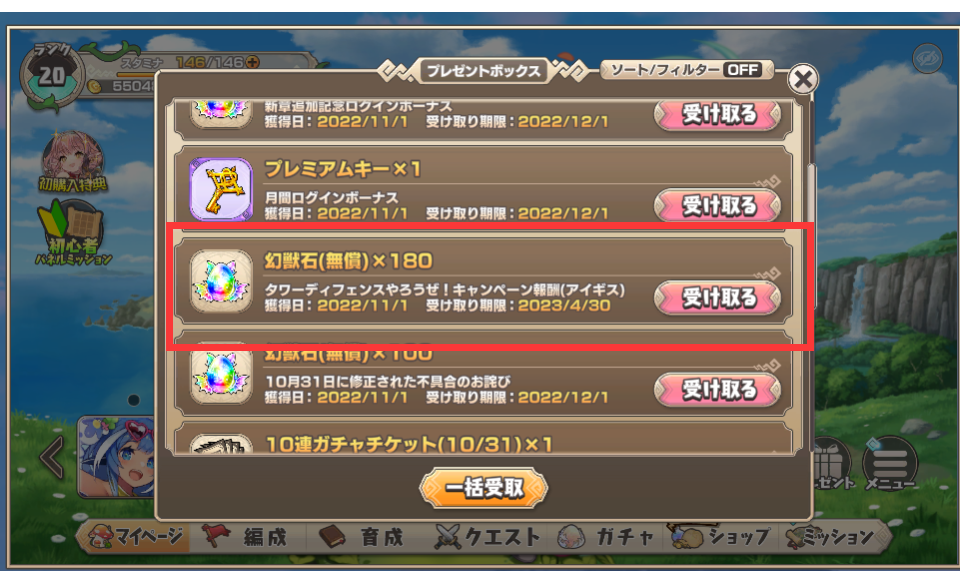 领取要求:在同一个DMM账号有游玩三个游戏的数据,并且在“其它”两个游戏达成条件所需进度后,重新登录“本游戏”可获得达成条件的奖励:0.6抽*20=12抽的货币。(与本游戏的进度无关,也与达成进度后是否登录其它游戏无关)