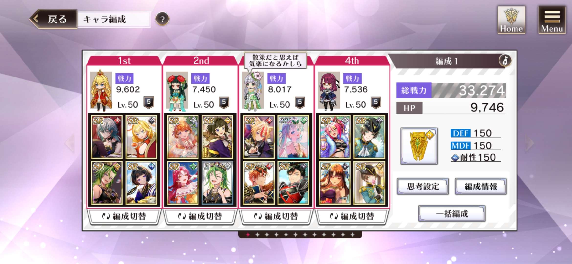 小役人等級65;全體50等;希望王4突,其他都0突;主副肖像畫進行度都點滿;屬性盾滿級;副卡部分希望王全塞高MAT,葬禮王高ATK,彗星王和清冽王塞高SPD並以魔法類型為佳;思考設定只有把清冽王一個Auto技能對象設定為MAT最高我方,其他不用設定因為敵人只有一體。