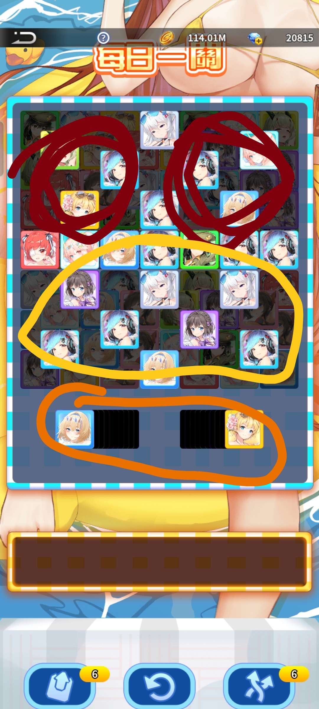 红圈是最容易翻车的地方,橙圈虽然比较厚,但是实际威胁不打,因为前期能消的很多,反而是红圈那里因为到了后期,很多方块都消得差不多了,就很难受。反正不行就用道具咯,道具就是拿来用的。