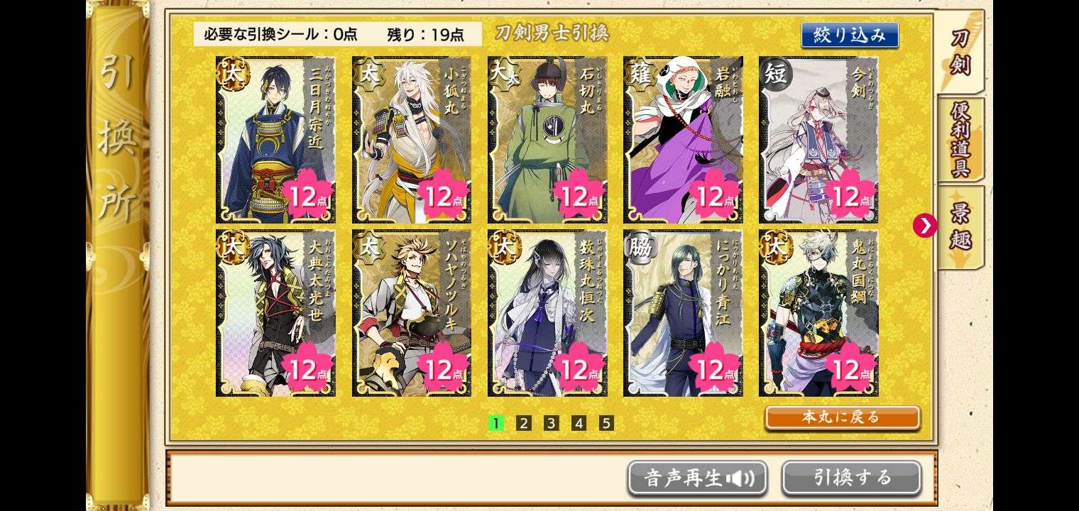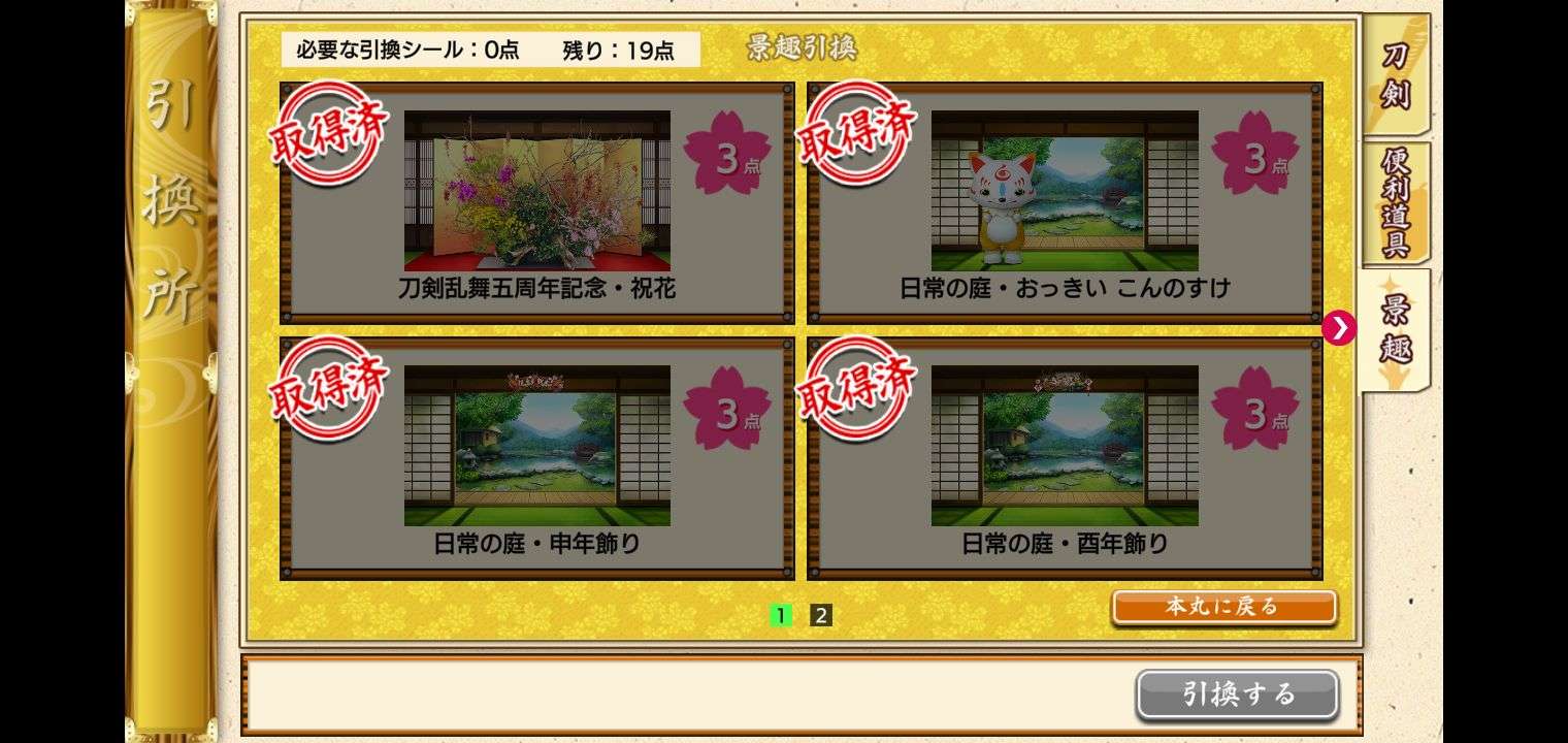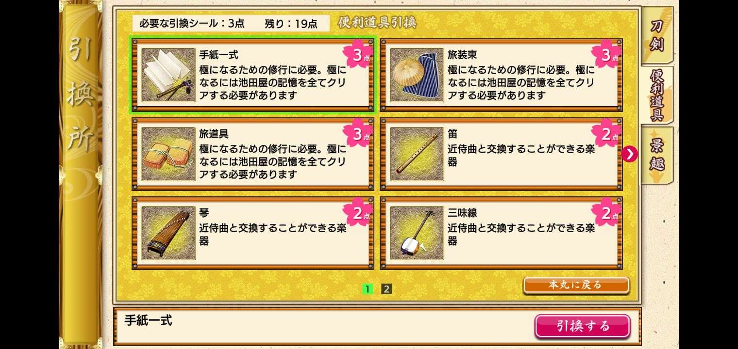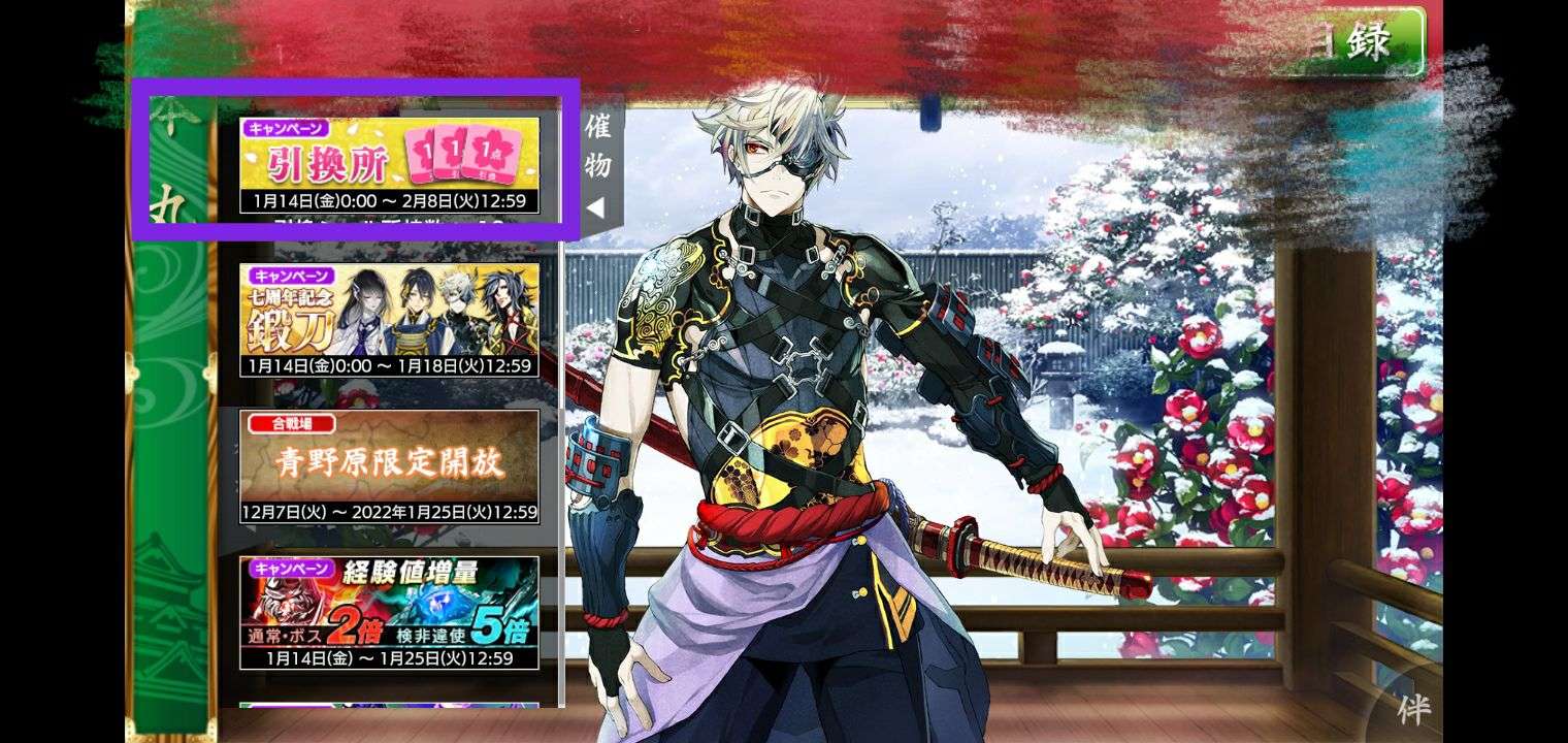 点击本丸界面左边的「催物」按钮,并且点击点击引换所的活动界面,就能进入引换所兑换物品