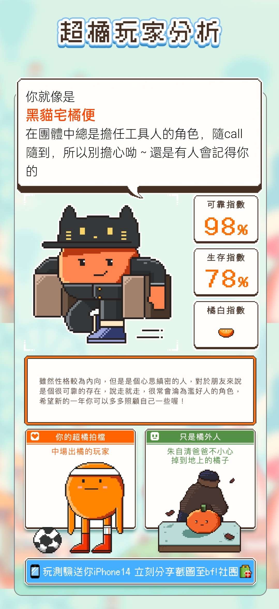 殺戮器官 話題製造機 2023-03-16 16:17 筆記(708) 這測驗一定是社牛出的,因為 為何沒有不拍照的選項 下次我也不會拍 為何沒有多看兩眼直接離開的選項 為何沒有完全不在意,不會生氣的選項 (我是不能重新買一個嗎) 好吧,但總之我的結果是 #超橘玩家分析
