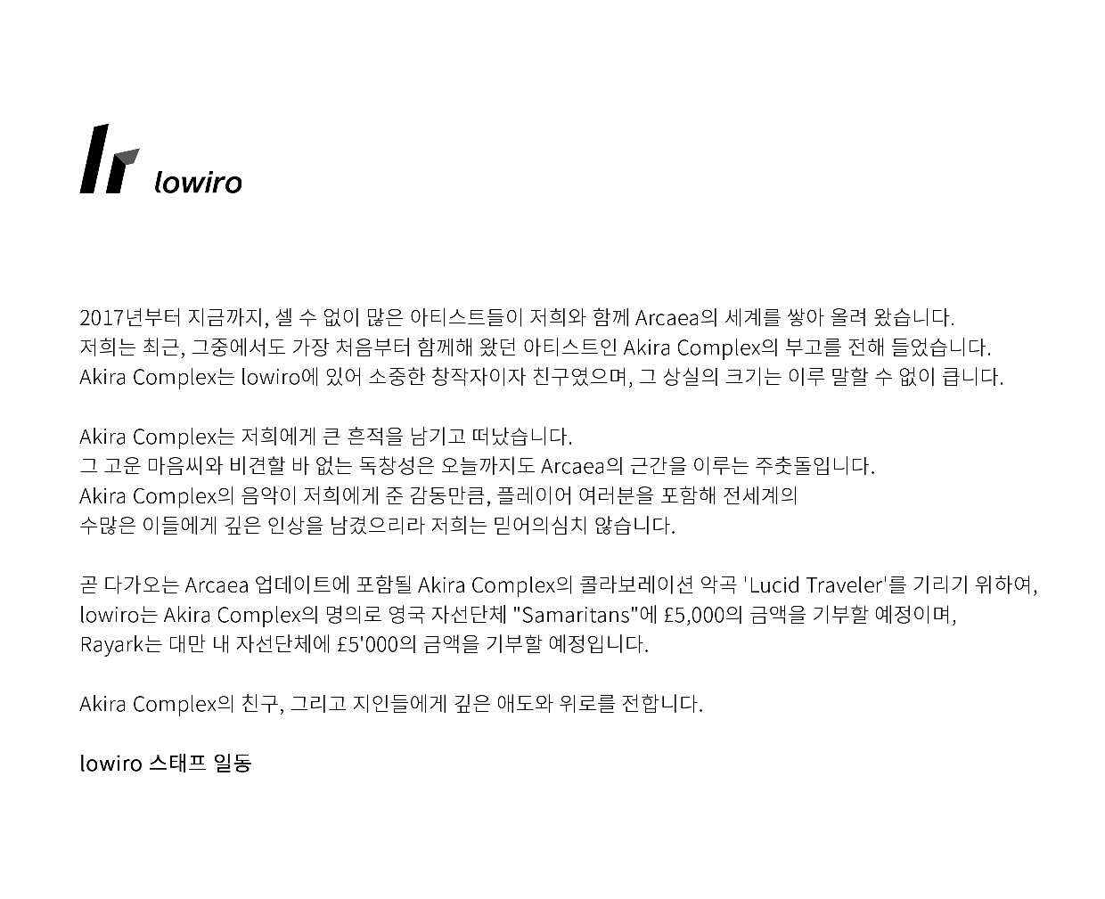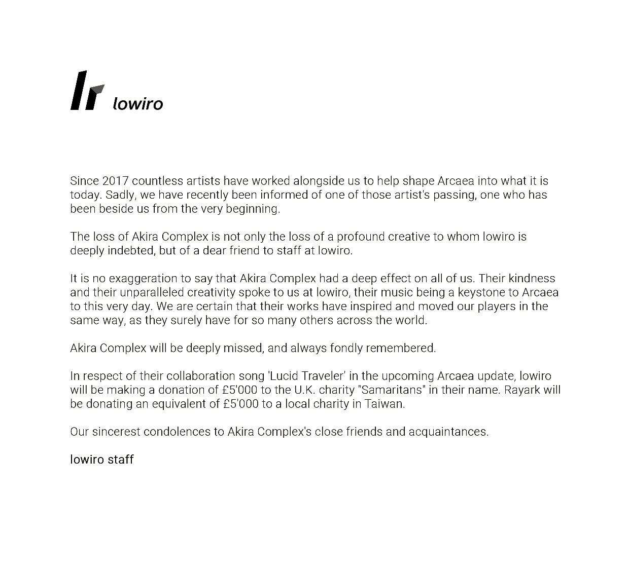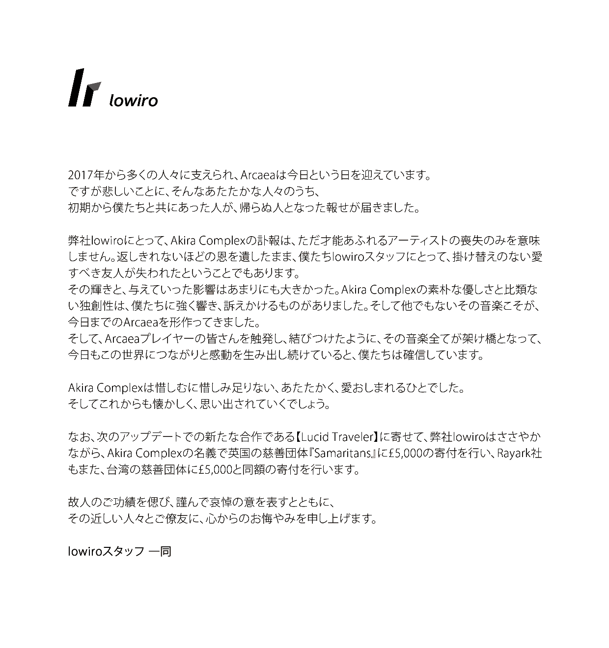 【转载】Lowiro对Akira Complex的慰问