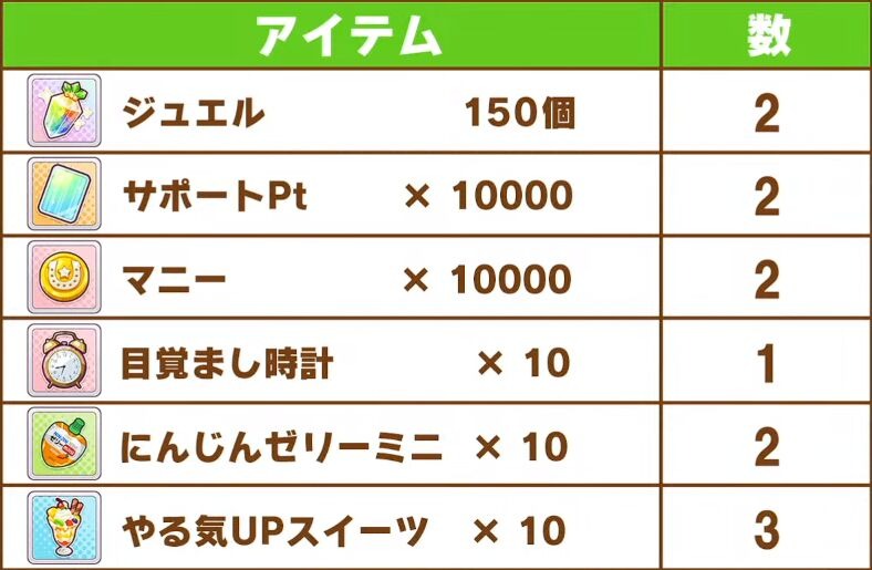 总计450萝卜,20000技能PT,20000金币,10闹钟,20竞技场果冻,30干劲甜点