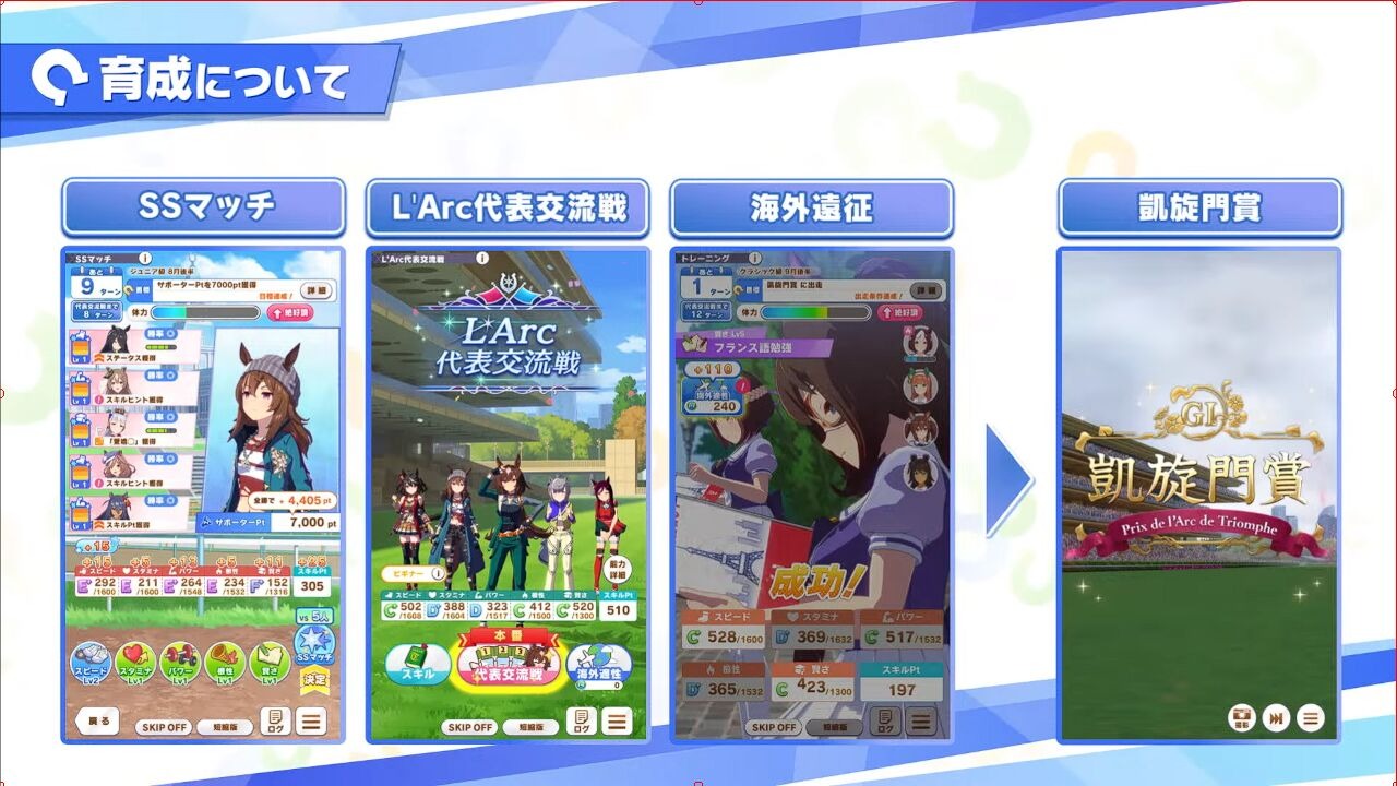 在基本育成目标的基础上增加SS配对赛,L'Arc代表交流赛,海外远征训练,古马级10月后凯旋门大赏