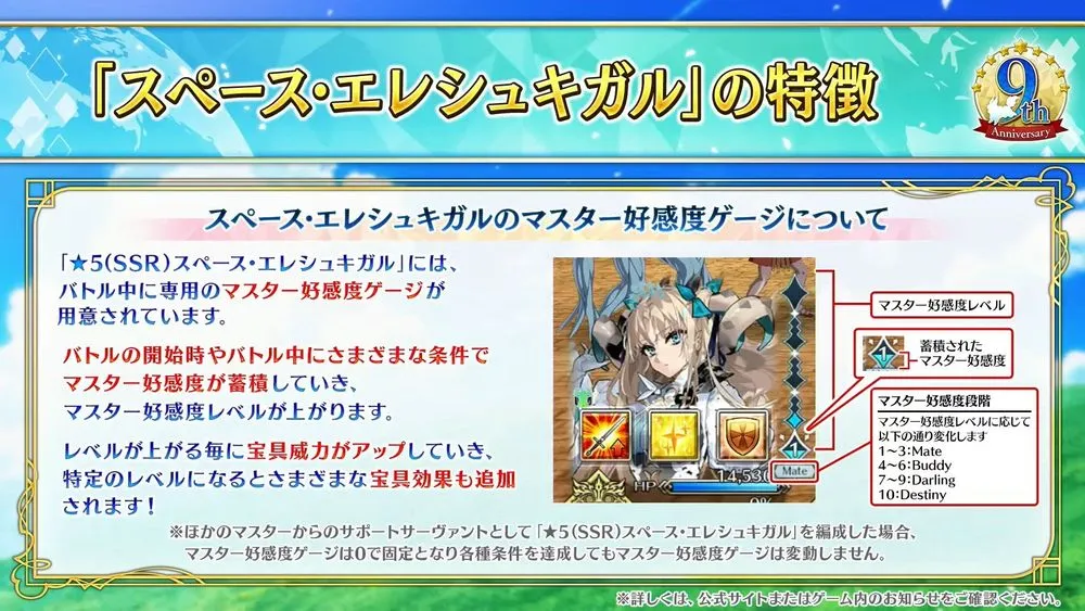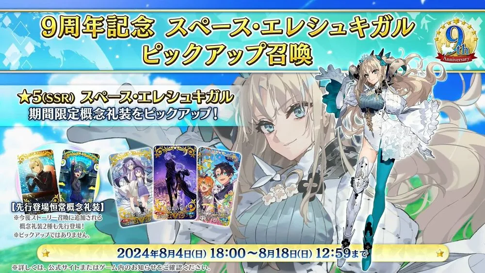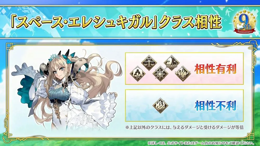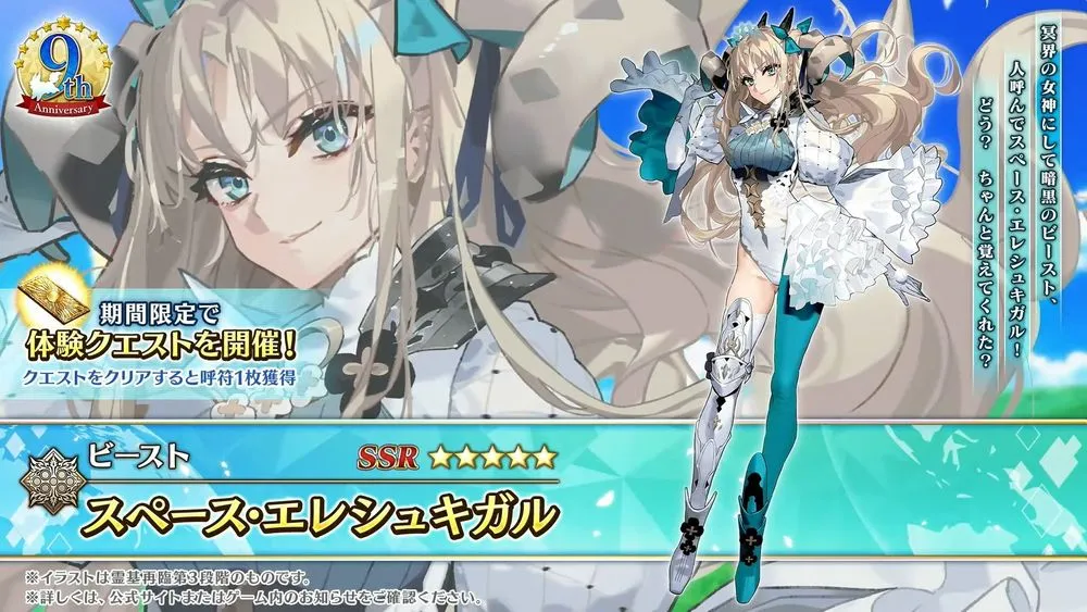 作為《Fate/Grand Order》日版 9 週年全新從者揭曉為「★5(SSR)太空埃列什基伽勒(Beast)」,靈基再臨第一階段為 埃列什基伽勒、靈基再臨第三階段則會變換為 太空埃列什基伽勒,玩家可先行在體驗關卡體驗角色的魅力並獲得「呼符 1 張」。