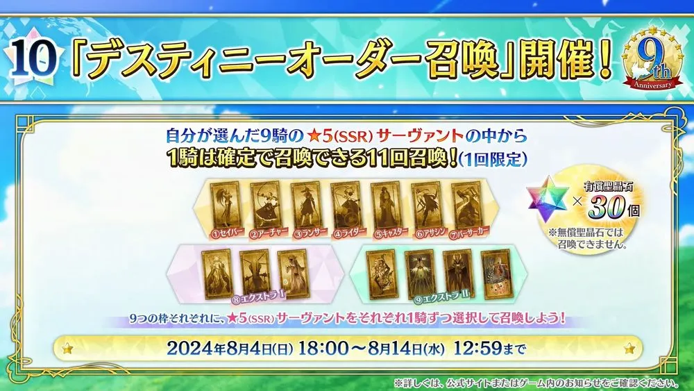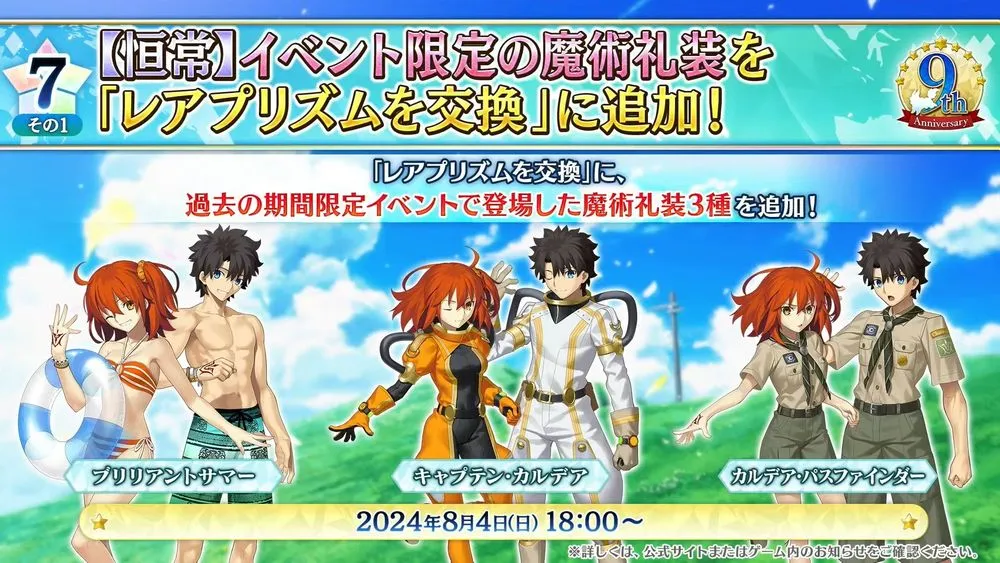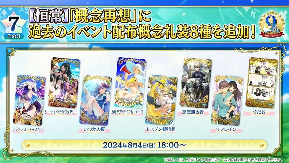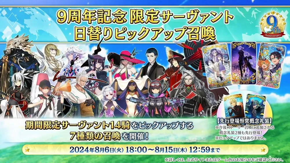 FGO PROJECT(Notes、Aniplex,Lasengle)旗下智慧型手機 RPG《Fate/Grand Order》日版,官方在4日進行的實體活動「Fate/Grand Order Fes. 2024 迦勒底放送局 9 週年 SP」當中,宣布展開發行 9 週年慶祝活動並釋出週年從者『太空埃列什基伽勒』。