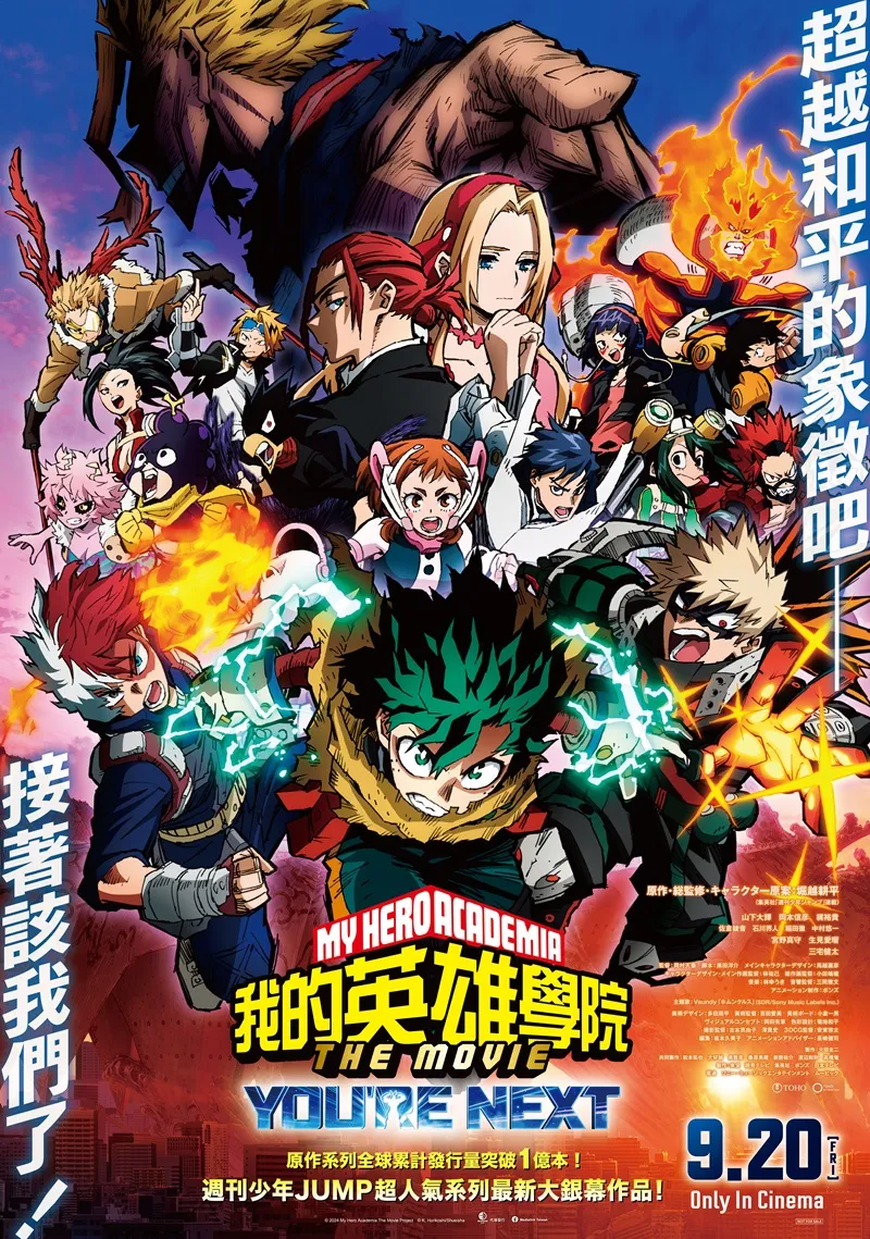 《我的英雄學院劇場版:You’re Next》即將於2024年9月20日在台灣正式上映,於2024年8月6日推出劇場版中文主海報與前導預告,這次的劇場版是由原著作者堀越耕平擔任總監修及角色設計的全新原創故事,敘述在這個人類大多都擁有名為「個性」的超常能力的世界裡,過去曾經被人稱為「和平象徵」的No.1英雄:歐爾麥特,在與「惡之帝王」決戰後,筋疲力盡地說出:「接下來,就輪到你了…。」他強大的意志力震撼了全世界,即使歐爾麥特在退下第一名的英雄光環後,他無私奉獻的精神與維護世界和平的決心,由出久、爆豪與烘焦凍等一眾雄英高中英雄科的學生們默默地繼承著。