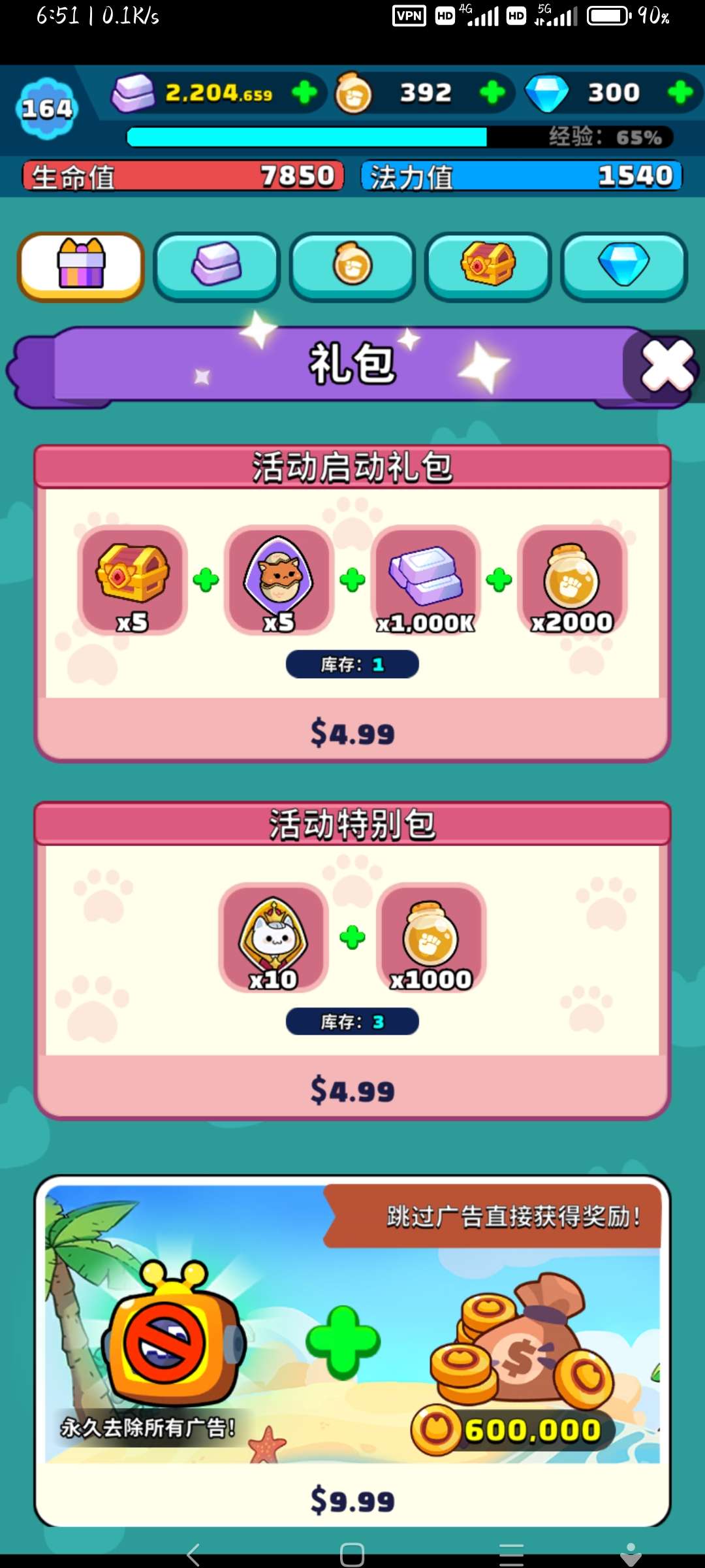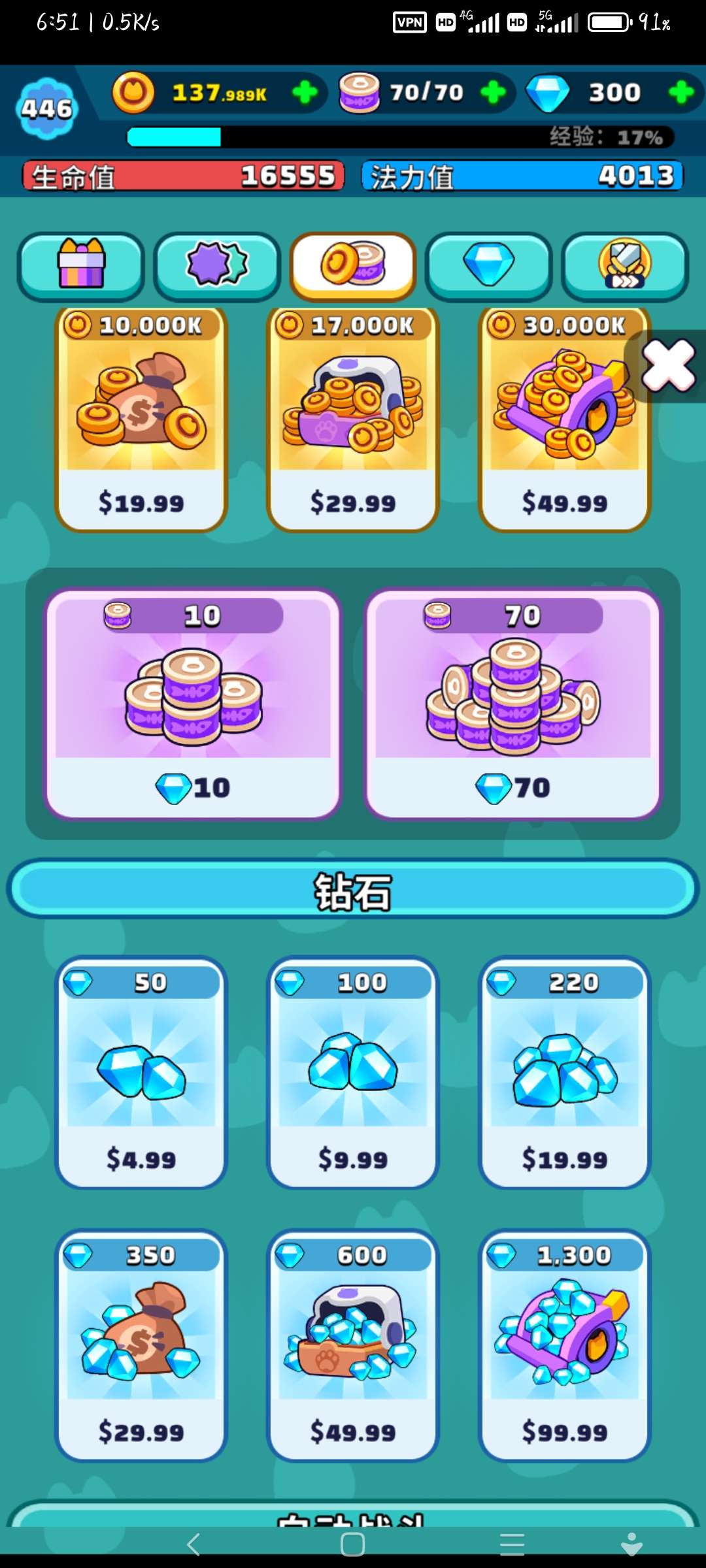 以上是推主线时的商店,钻石用途为买罐头,抽一般角色(白板和紫色),钻石来源为每天登录的一周赠送和活动排名奖励。罐头可以重复刷打过的关卡获得,每次一个,白板30罐一片碎片,紫色50罐一片,商店一小时刷新一次。