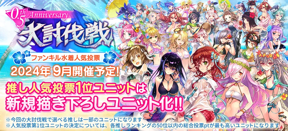 此外,也將復刻精選轉蛋,並舉辦泳裝角色推廣活動「大討伐戰」。遊戲內的限時活動將設有投票點數「投票 Pt」系統,玩家可挑戰限時關卡來競逐推廣角色的排名。根據投票結果,玩家將獲得遊戲內物品以及包含推廣角色 SBT 的豐厚獎勵。此外,獲得人氣投票最高票數的角色將獲得全新繪製的角色並實裝為可玩單位。