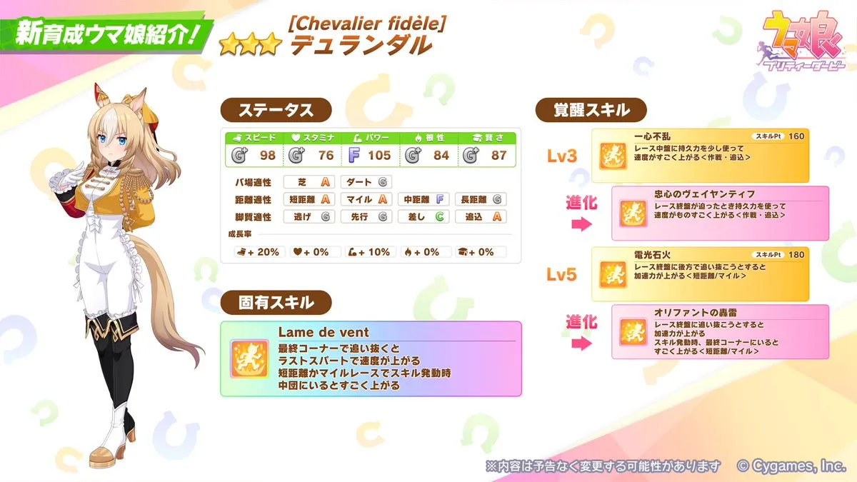 新馬娘卡池PU角色為 ★★★ 多旺達 [Chevalier fidèle]デュランダル :多旺達是位充滿騎士精神、重視禮節的馬娘,她追求的是能像劍一般「鋒利地開闢前方道路的末段衝刺」。夢想著有一天能像故事中稱職的騎士一樣遇見值得獻上忠義的王一一也就是訓練師。時常惦記著要有禮貌舉止要端莊。