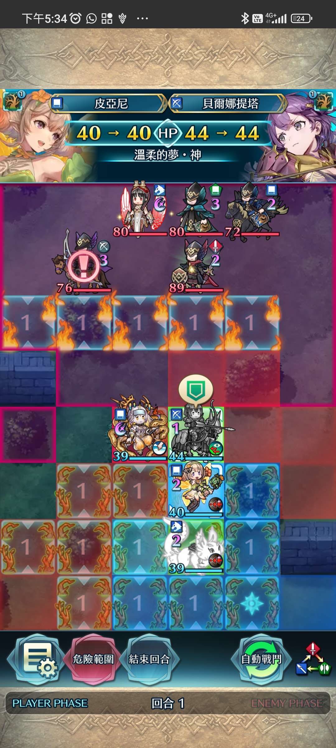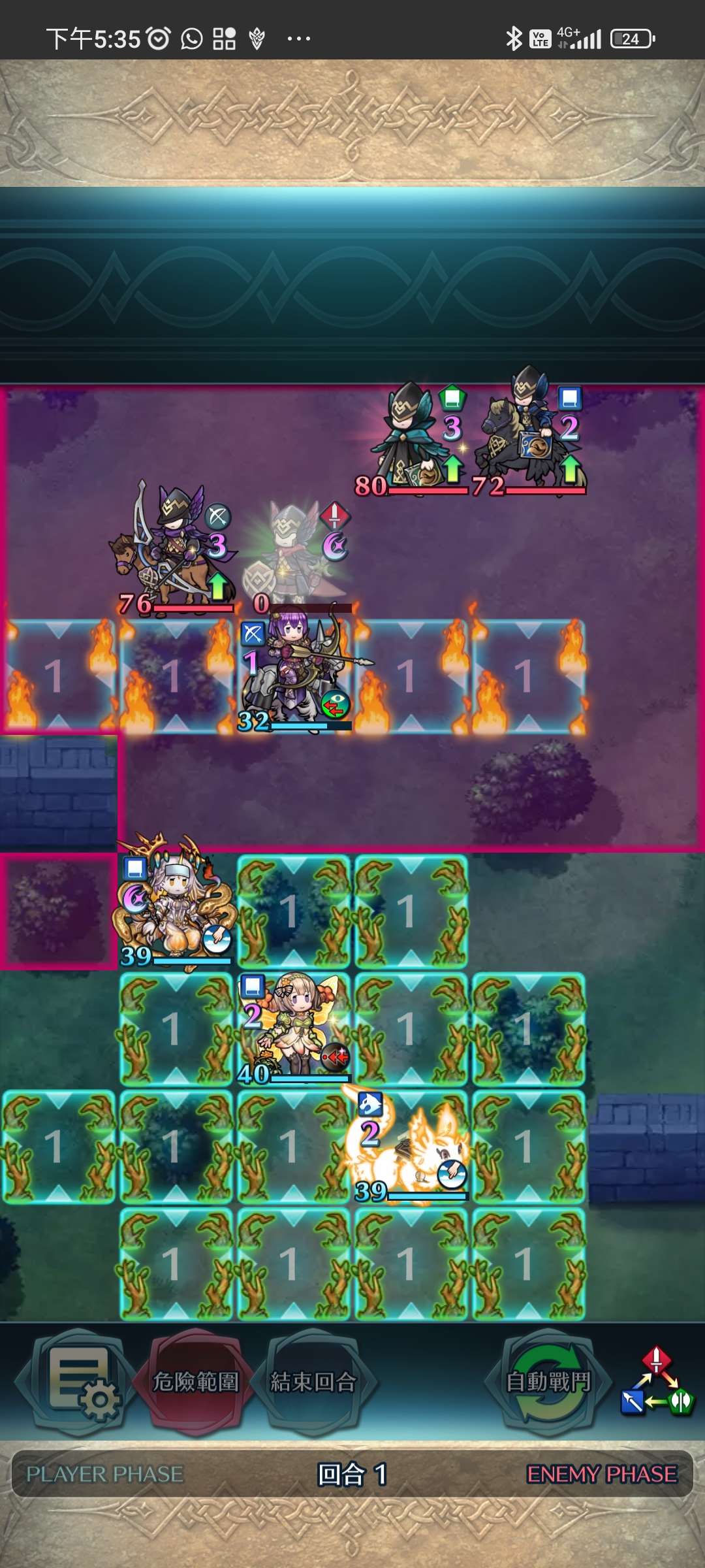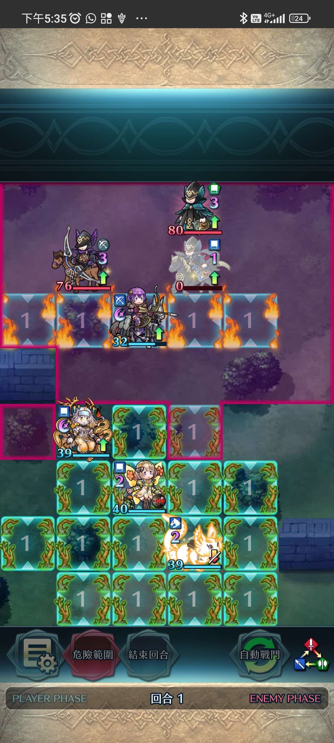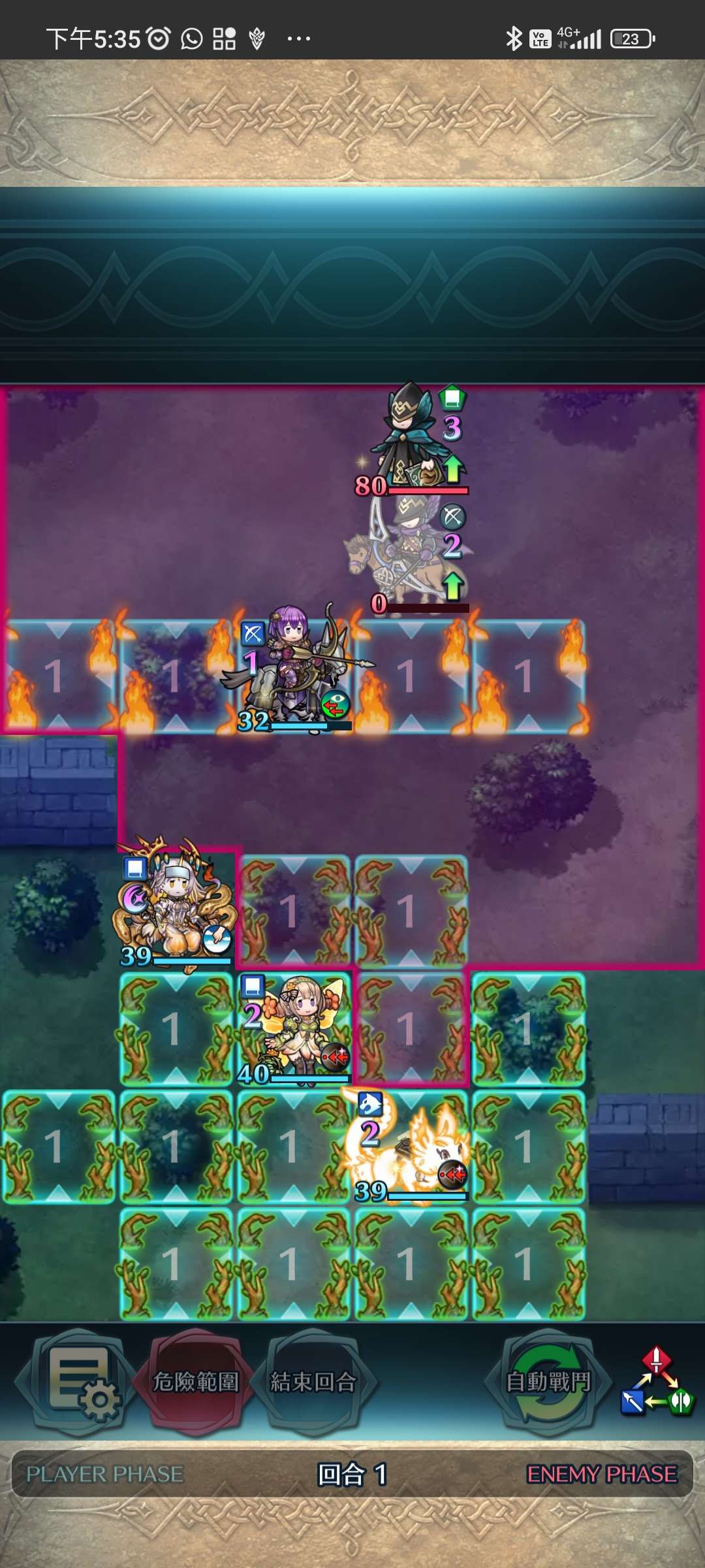 第一回合,松鼠帶出大蛇,大蛇將近護重斧殲滅。家裡蹲上前線,受美夢再動後,直接將鳥姐送回家。大蛇拉美夢對準家裡蹲增強數值。敵回合,家裡蹲捱下步劍攻擊後後殺,再連續埋伏藍法、弓騎與綠法。全員殲滅,完。