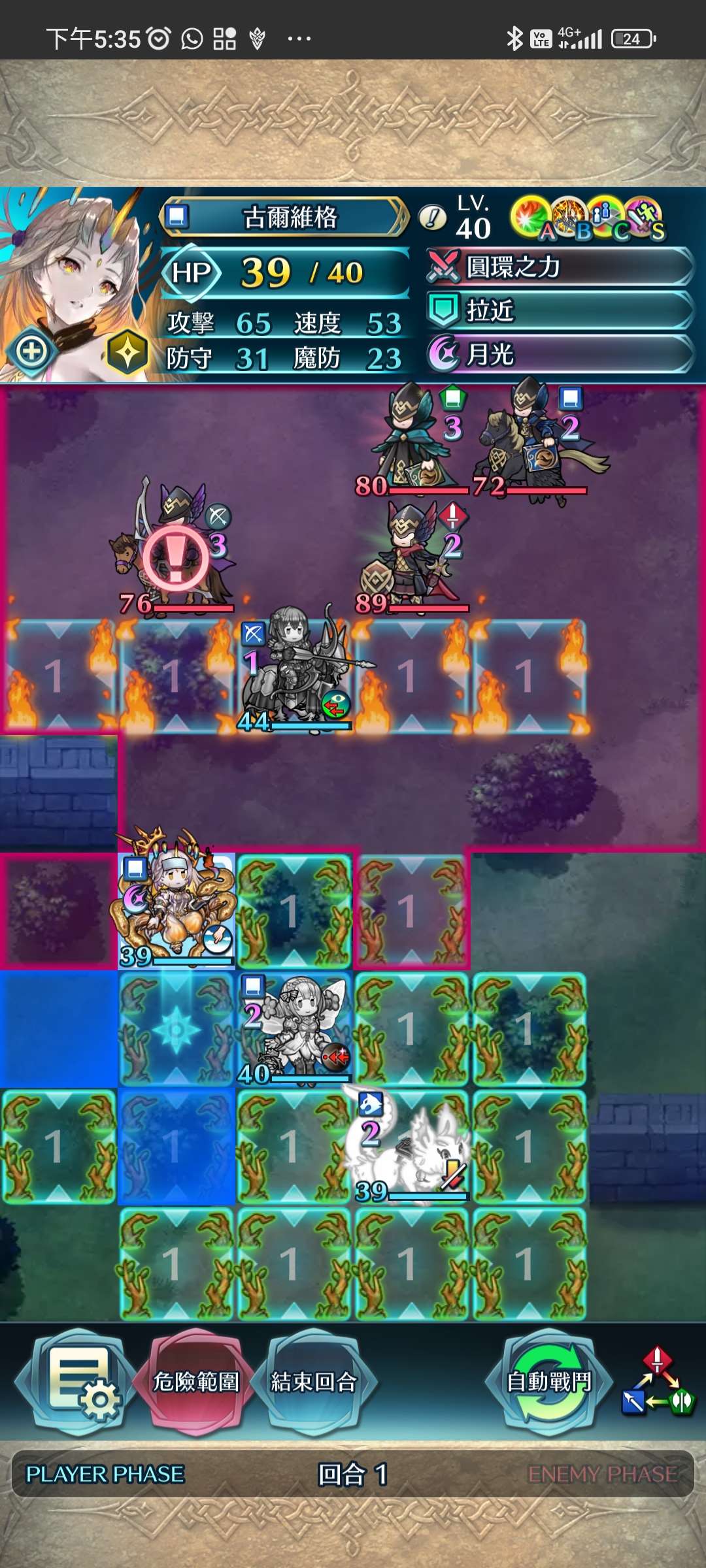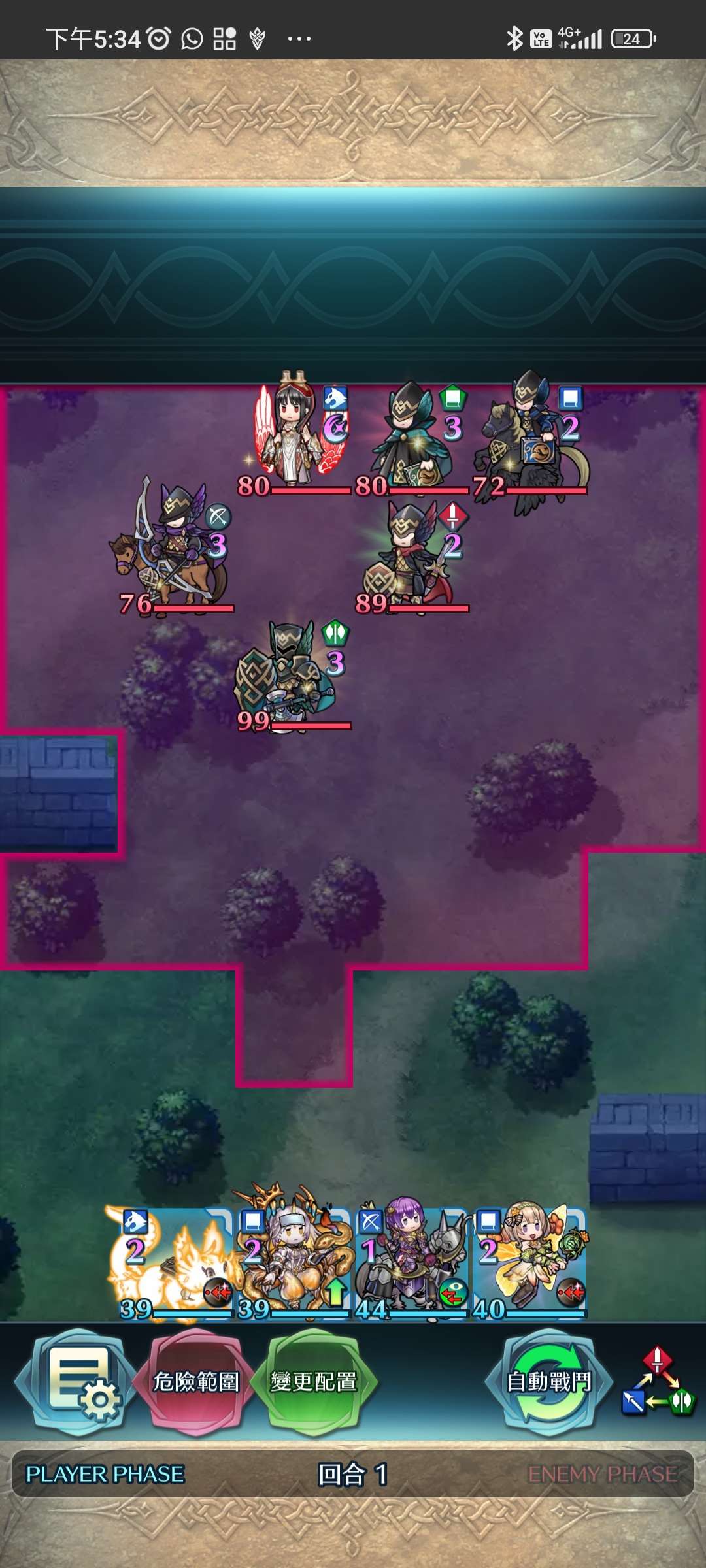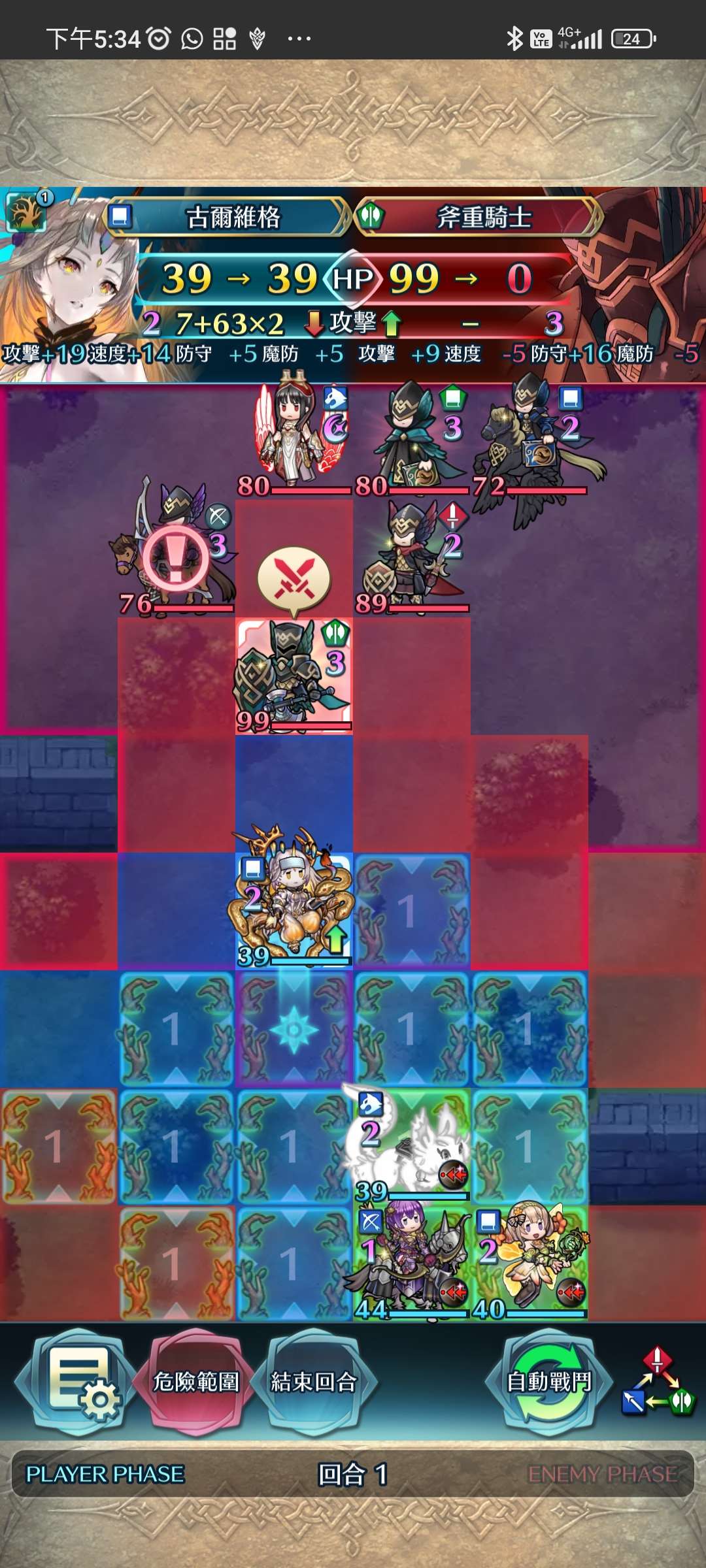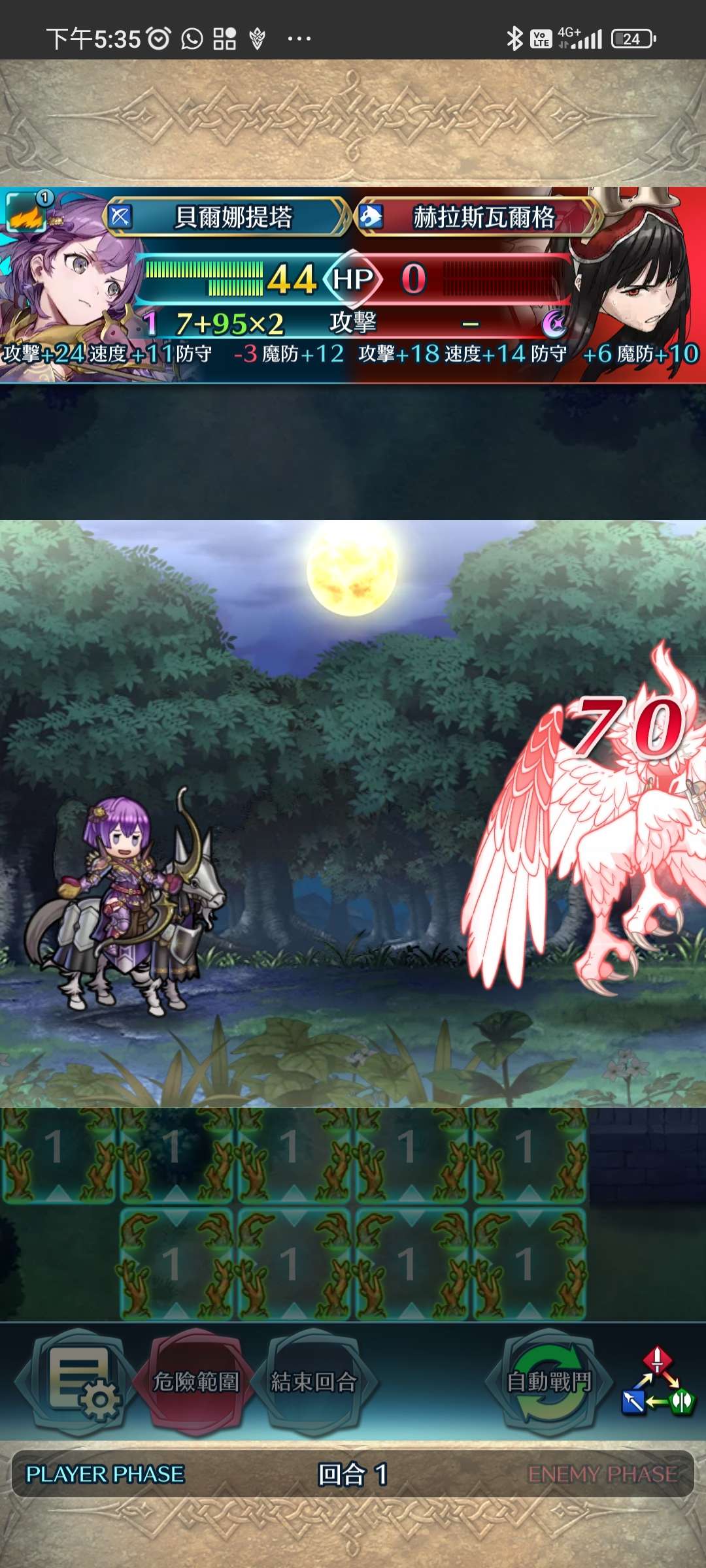 第一回合,松鼠帶出大蛇,大蛇將近護重斧殲滅。家裡蹲上前線,受美夢再動後,直接將鳥姐送回家。大蛇拉美夢對準家裡蹲增強數值。敵回合,家裡蹲捱下步劍攻擊後後殺,再連續埋伏藍法、弓騎與綠法。全員殲滅,完。