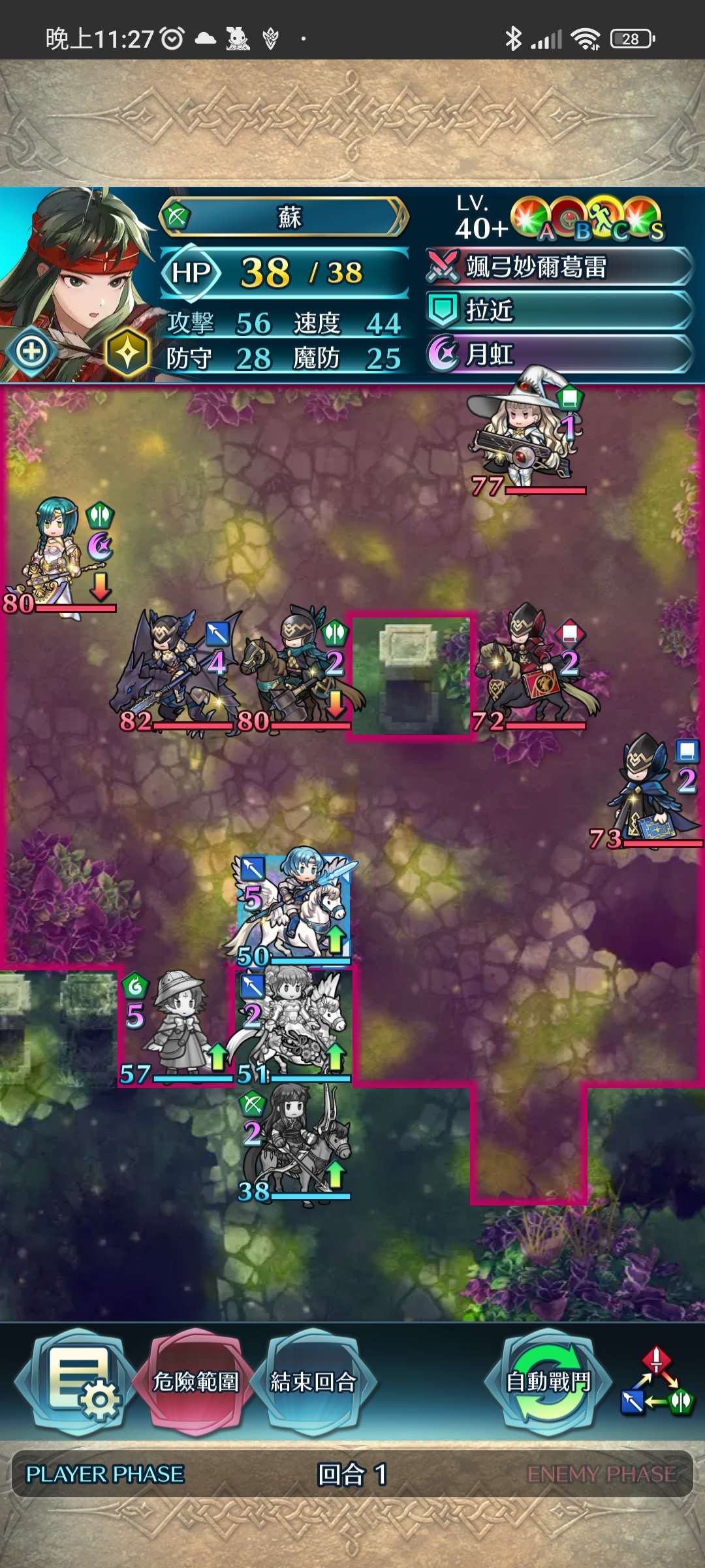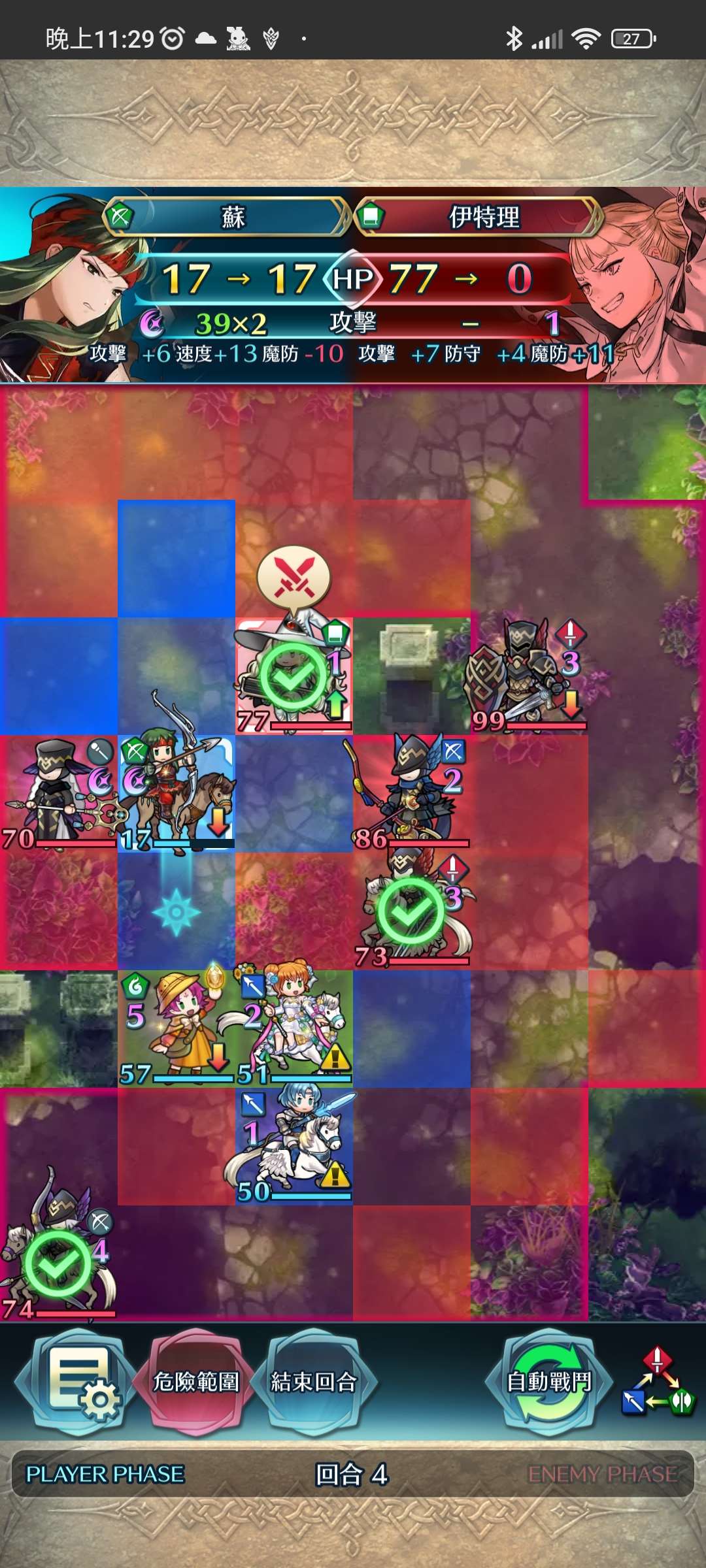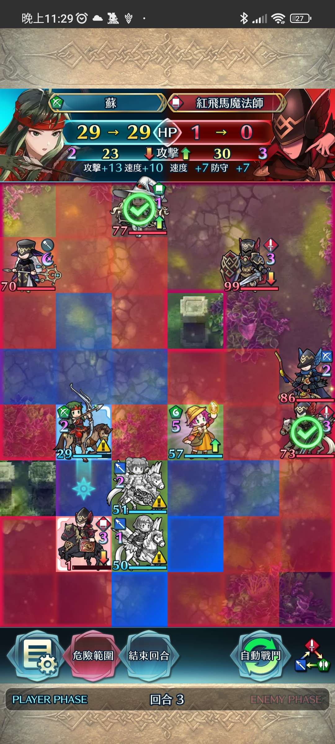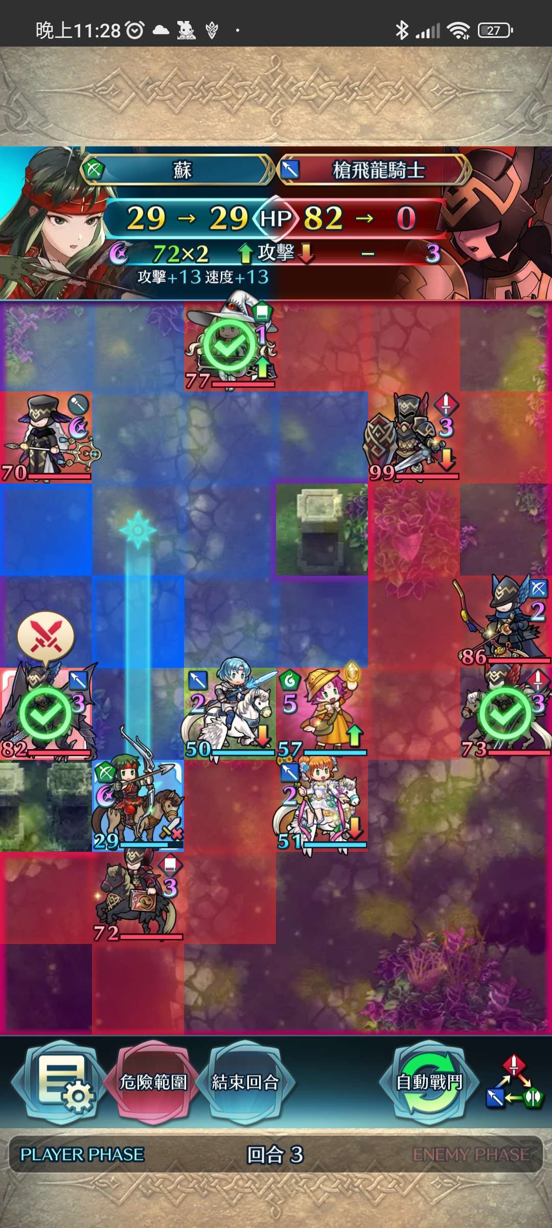 第二回合,蘇射下殘血飛槍,再動後以蒂特帶往左路,再將大奶戰神送返天界。琺躲入中間安全地帶。敵回合舞孃反殺紅飛龍。